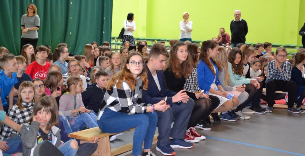 Podczas drugiej części spotkania uczniowie klas 4-8 zadawali naszym Gościom pytania. Odbyło się też rozstrzygnięcie konkursu na Projekt Sztandaru naszej szkoły. Pan Prezydent i Pani Prezydent razem z Panią Dyrektor Anetą Pawłowską i Agnieszką Krasowską wręczyli dzieciom nagrody i dyplomy. Było bardzo uroczyście i radośnie. Spotkanie to na długo pozostanie w naszej pamięci i w naszych sercach.