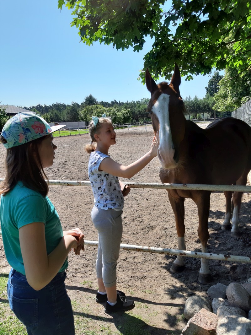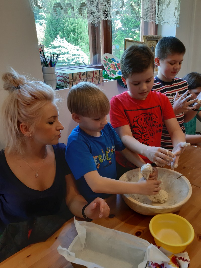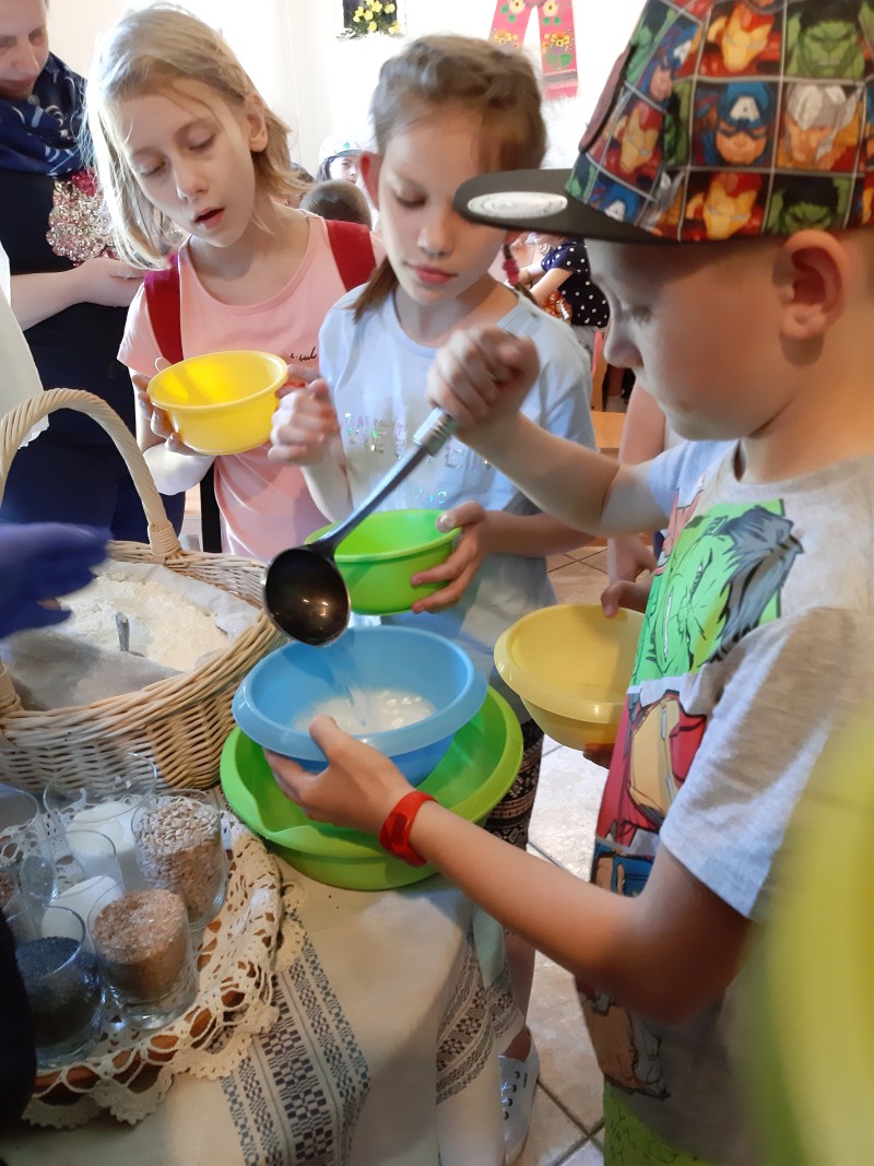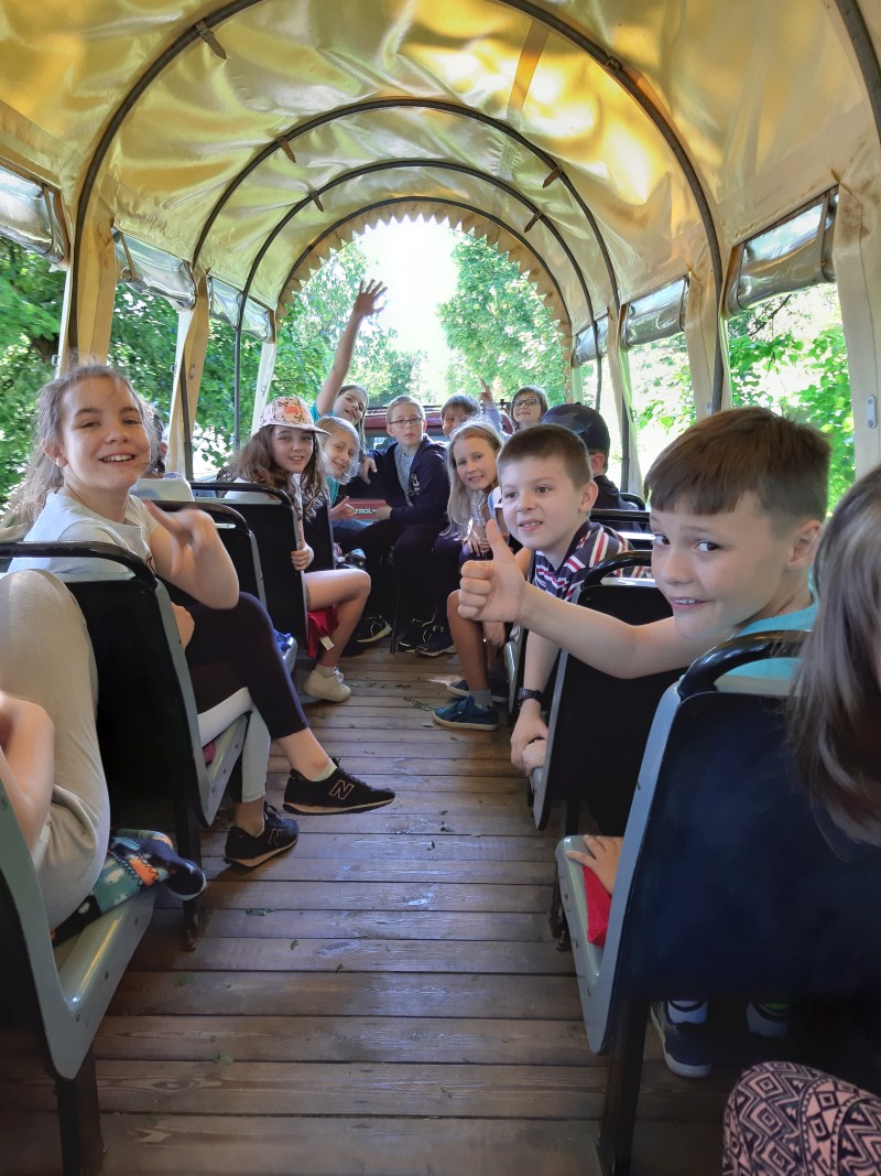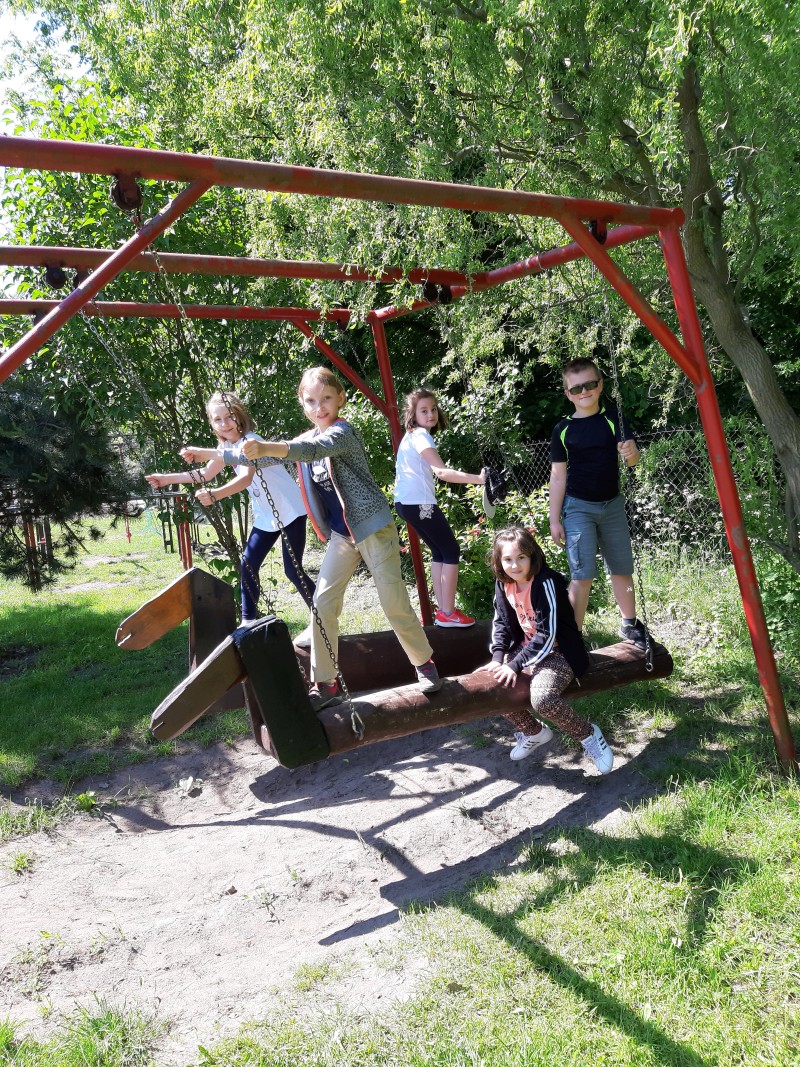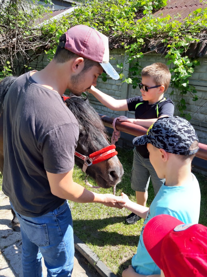 W piątek 31.05.2019 r.  uczniowie klasy IV a oraz IV c z okazji Dnia Dziecka wybrali się na wycieczkę do Nieborowa. Gościliśmy w gospodarstwie agroturystycznym „Stajnia u kowala”. W pięknym otoczeniu przyrody uczniowie mogli karmić konie oraz na nich jeździć. Wozem traperskim zwiedzali Puszczę Bolimowską. Na ogromnym placu zabaw mogli korzystać z różnych atrakcji. Strzelali z łuku, grali w badmintona, skakali na trampolinach, grali na mini polu golfowym, zjeżdżali na linie oraz jeździli na trójkołowych rowerach. Wszystko zakończyło się ogniskiem z kiełbaskami. Radośni i uśmiechnięci udali się do kolejnego gospodarstwa na lekcję edukacyjną „Od ziarenka do bochenka”. Gospodyni w barwny sposób opowiedziała o różnych gatunkach zbóż oraz o tradycji pieczenia chleba. Uczniowie samodzielnie wyrabiali ciasto na chleb. Piekli również podpłomyki. W malowniczym ogrodzie uczniowie częstowali się świeżym chlebem oraz własnoręcznie zrobionym masłem. Karmili zwierzęta, bawili się w lesie w specjalnie przygotowanym miejscu. Na koniec dostaliśmy pięknie wypieczone chleby. To był wspaniały czas radości i beztroskiej zabawy.