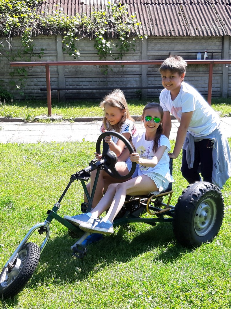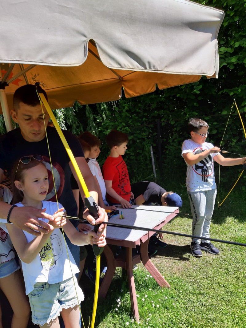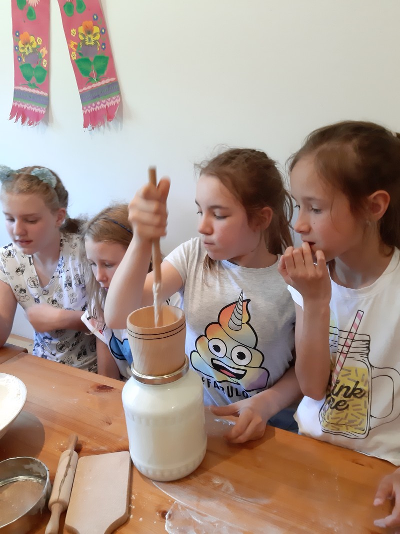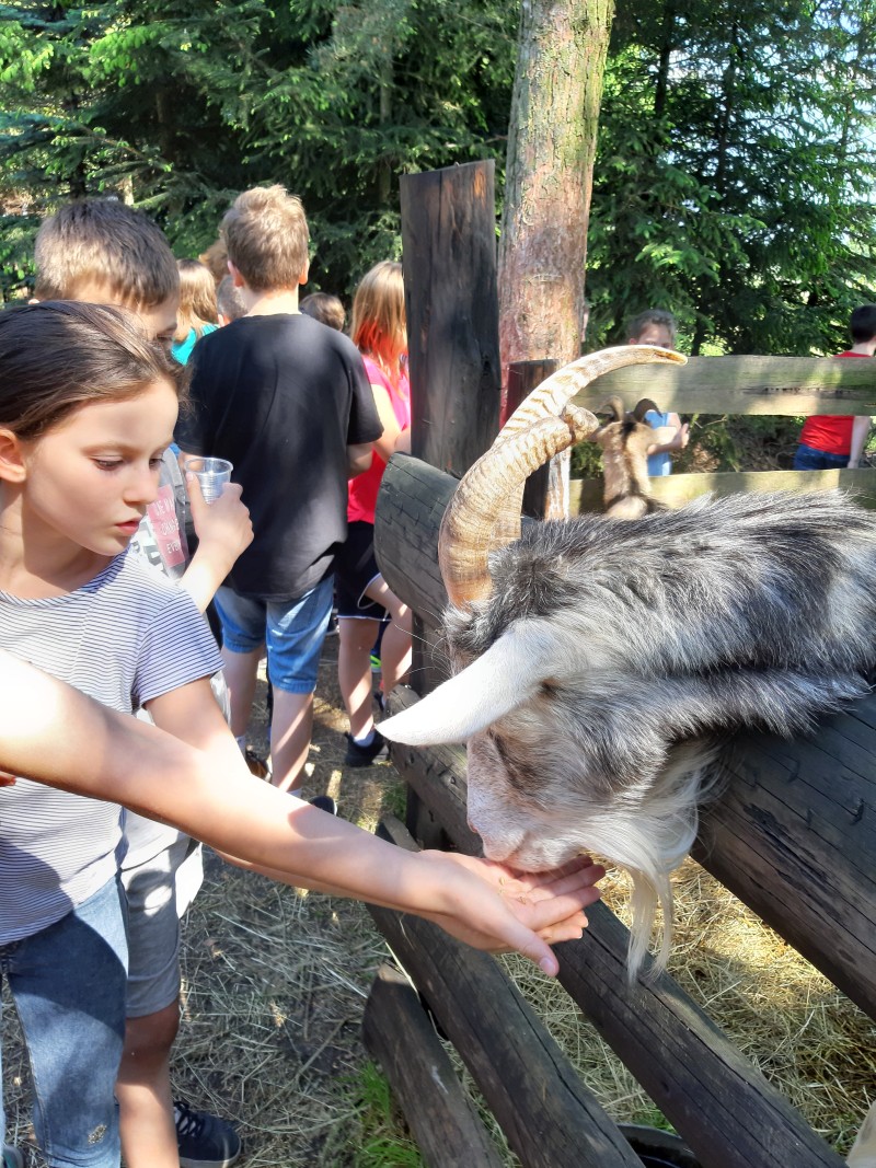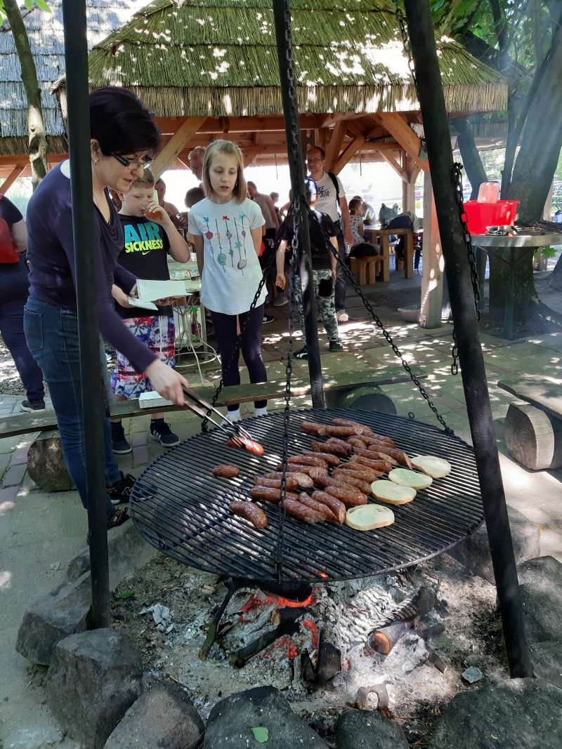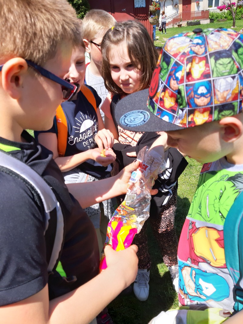 W piątek 31.05.2019 r.  uczniowie klasy IV a oraz IV c z okazji Dnia Dziecka wybrali się na wycieczkę do Nieborowa. Gościliśmy w gospodarstwie agroturystycznym „Stajnia u kowala”. W pięknym otoczeniu przyrody uczniowie mogli karmić konie oraz na nich jeździć. Wozem traperskim zwiedzali Puszczę Bolimowską. Na ogromnym placu zabaw mogli korzystać z różnych atrakcji. Strzelali z łuku, grali w badmintona, skakali na trampolinach, grali na mini polu golfowym, zjeżdżali na linie oraz jeździli na trójkołowych rowerach. Wszystko zakończyło się ogniskiem z kiełbaskami. Radośni i uśmiechnięci udali się do kolejnego gospodarstwa na lekcję edukacyjną „Od ziarenka do bochenka”. Gospodyni w barwny sposób opowiedziała o różnych gatunkach zbóż oraz o tradycji pieczenia chleba. Uczniowie samodzielnie wyrabiali ciasto na chleb. Piekli również podpłomyki. W malowniczym ogrodzie uczniowie częstowali się świeżym chlebem oraz własnoręcznie zrobionym masłem. Karmili zwierzęta, bawili się w lesie w specjalnie przygotowanym miejscu. Na koniec dostaliśmy pięknie wypieczone chleby. To był wspaniały czas radości i beztroskiej zabawy.