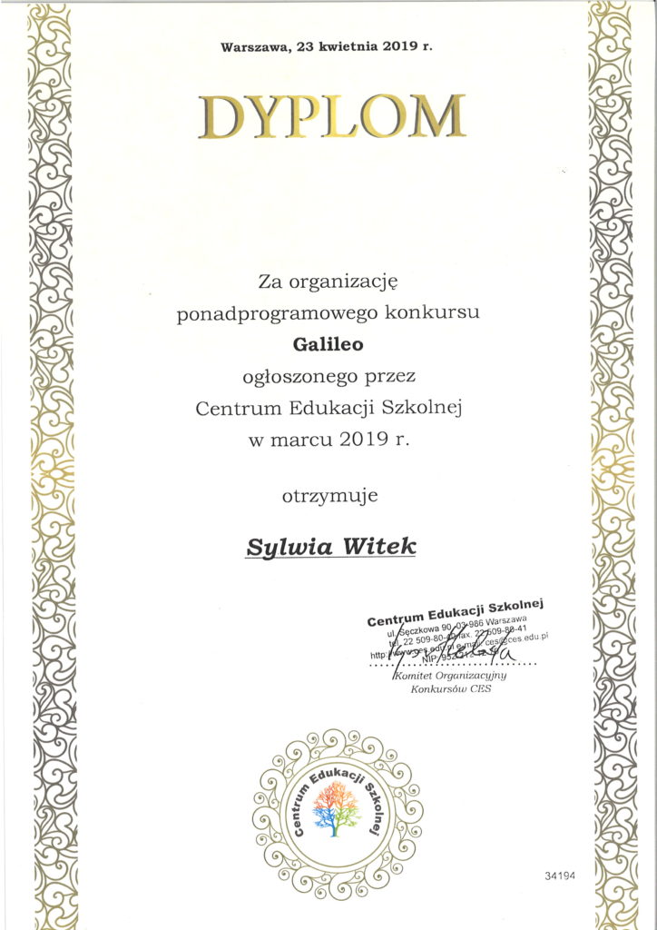 zajęcia 15. miejsca w ogólnopolskim konkursie Galileo z chemii, zorganizowanym przez Centrum Edukacji Szkolnej.