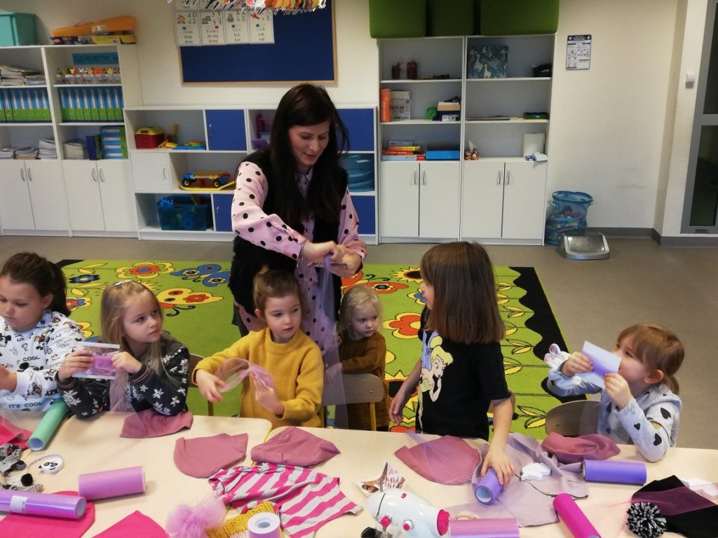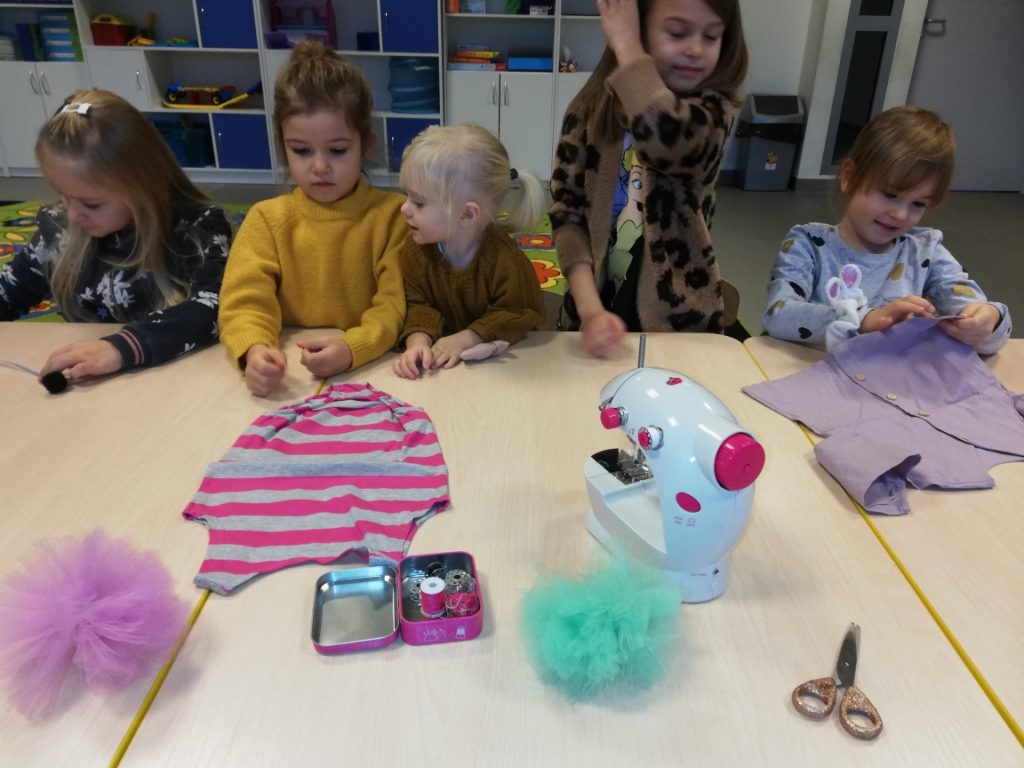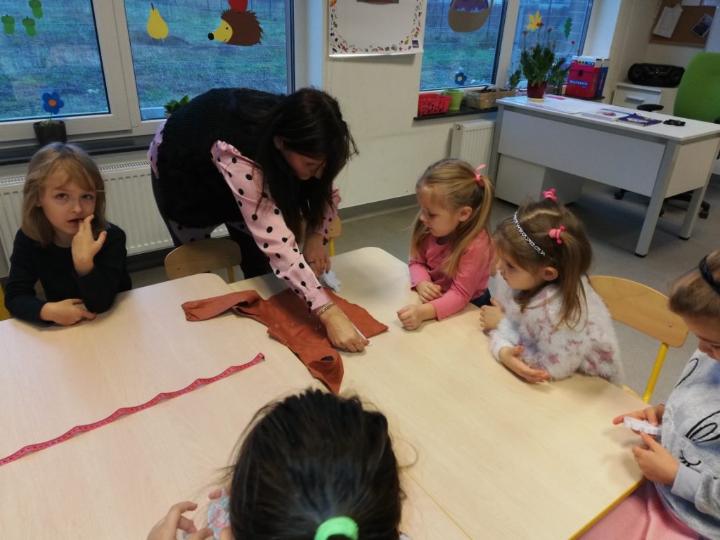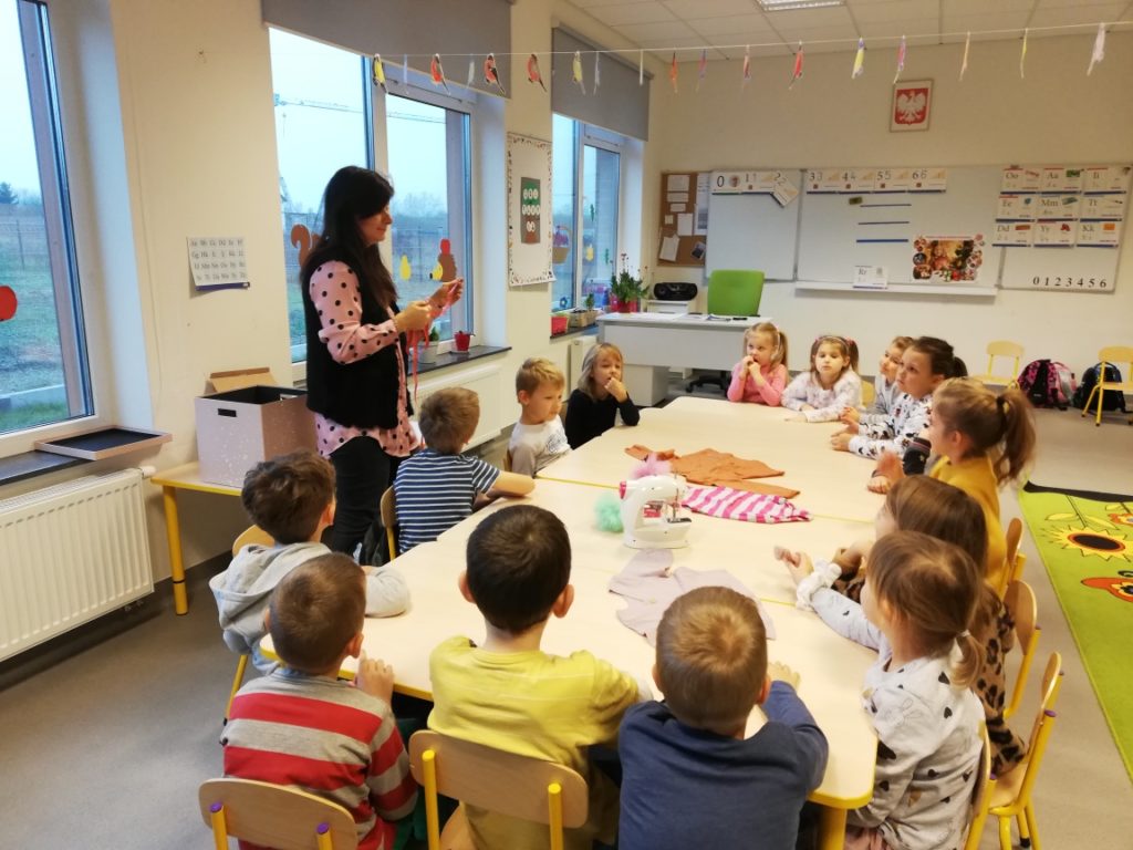 Pani Paulina wyjaśniła dzieciom jakie są rodzaje materiałów, pokazała narzędzia pracy projektanta odzieży oraz krawca. Opowiedziała także jaka droga wiedzie od projektu ubrania do gotowego produktu odzieżowego, który kupujemy w sklepie czy przez internet. Dzieci poznały zastosowanie centymetra krawieckiego i maszyny do szycia. Atrakcją spotkania było wykonanie tiulowych pomponów do czapek i do dekoracji wnętrz. Mali projektanci zaprezentowali swoje projekty nakryć głowy na wspólnych zdjęciach. Jesteśmy wdzięczni Pani Paulinie za ciekawe warsztaty i ogromne zaangażowanie w życie naszej klasy!