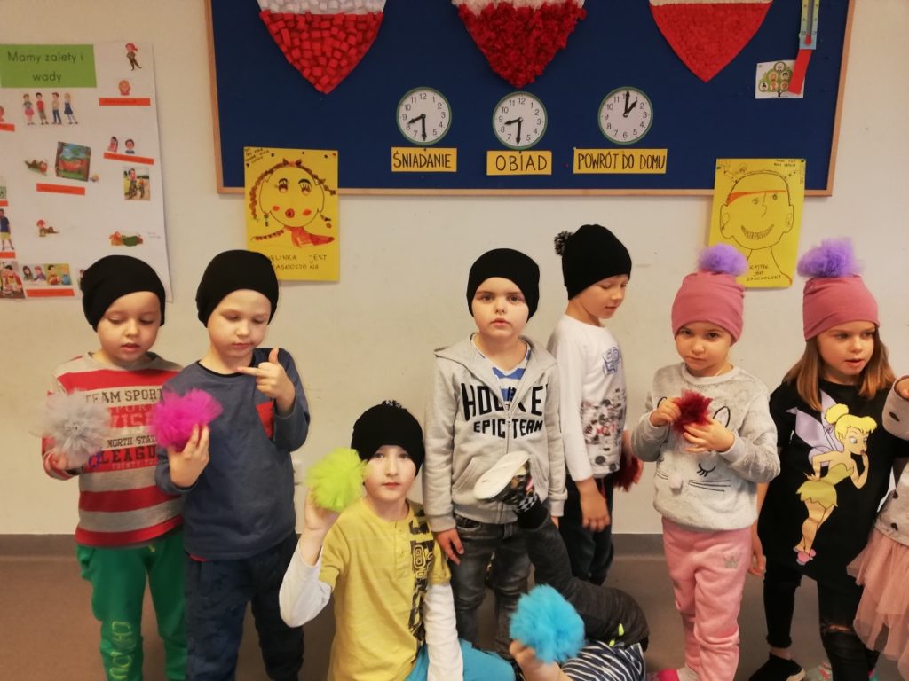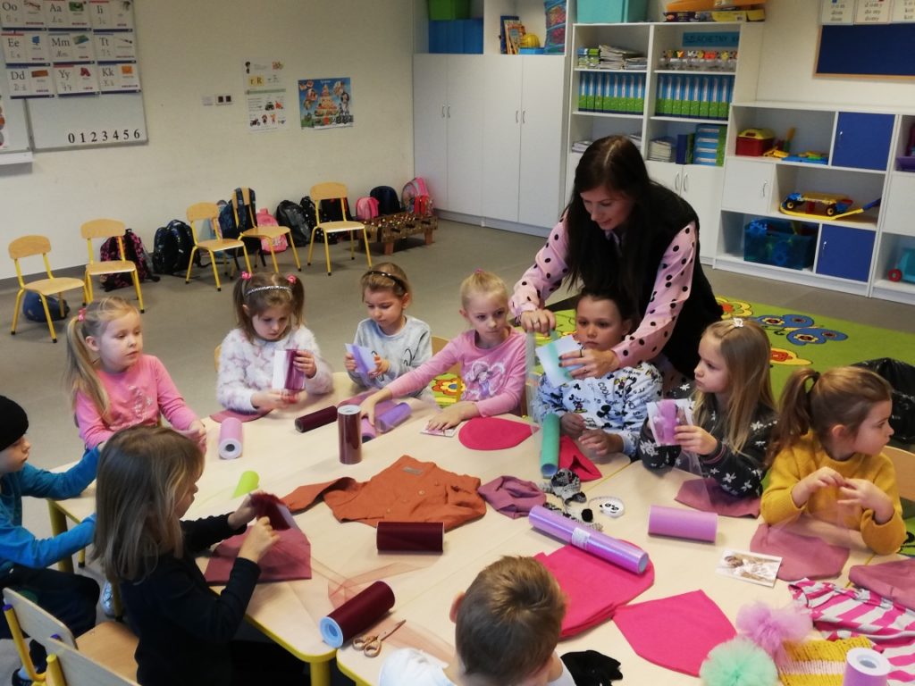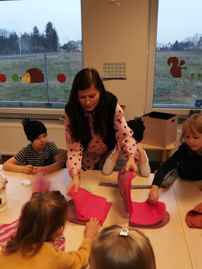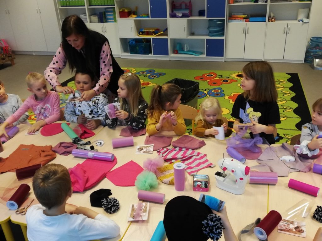 Pani Paulina wyjaśniła dzieciom jakie są rodzaje materiałów, pokazała narzędzia pracy projektanta odzieży oraz krawca. Opowiedziała także jaka droga wiedzie od projektu ubrania do gotowego produktu odzieżowego, który kupujemy w sklepie czy przez internet. Dzieci poznały zastosowanie centymetra krawieckiego i maszyny do szycia. Atrakcją spotkania było wykonanie tiulowych pomponów do czapek i do dekoracji wnętrz. Mali projektanci zaprezentowali swoje projekty nakryć głowy na wspólnych zdjęciach. Jesteśmy wdzięczni Pani Paulinie za ciekawe warsztaty i ogromne zaangażowanie w życie naszej klasy!