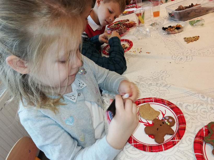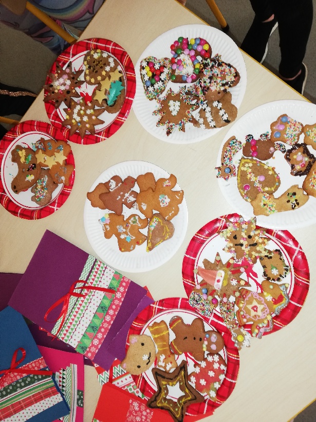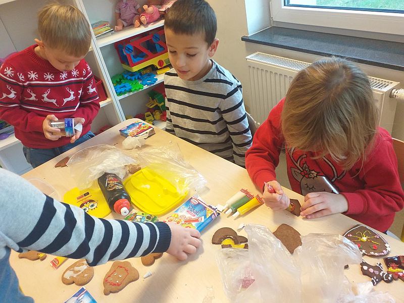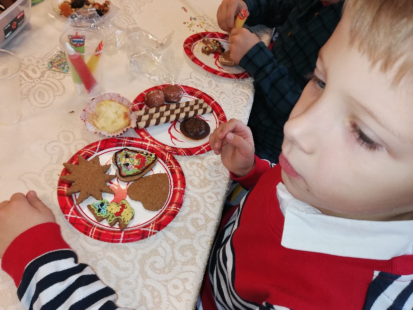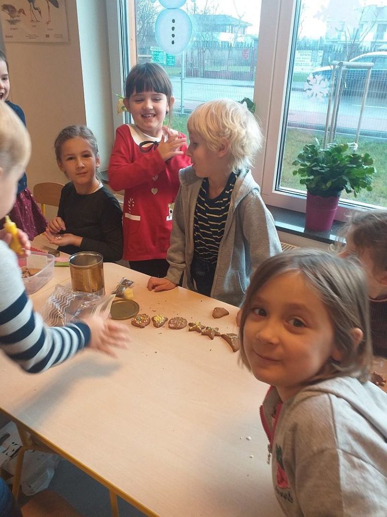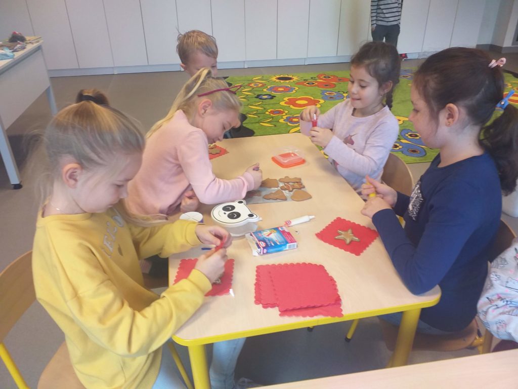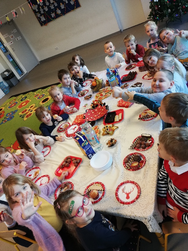 Przedświąteczny czas najmłodsi uczniowie naszej szkoły z klas 0A i 0C spędzili twórczo i niezwykle serdecznie. Uczniowie przy wspólnym stole zasiedli, by podzielić się opłatkiem i złożyć sobie nawzajem życzenia. Kochane mamy upiekły pierniczki, a dzieci je udekorowały. Wykonały także kartki świąteczne z motywami choinek.