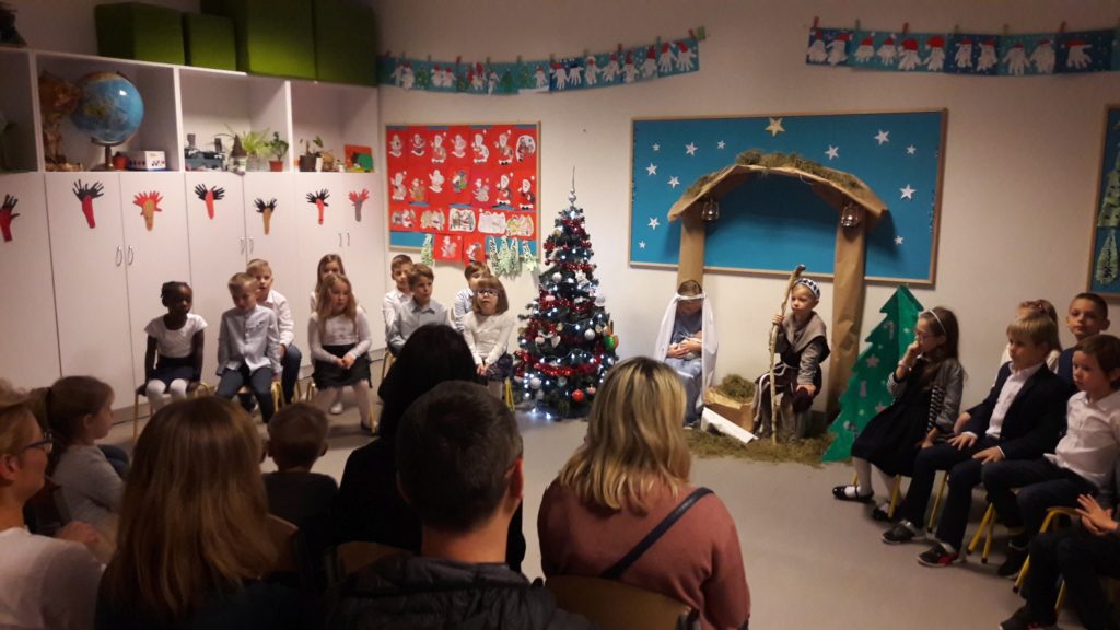 Dnia 19 grudnia 2019 r. uczniowie klasy 1A zaprosili do swojego „klasowego Betlejem” ukochane osoby, swoich Rodziców i rodzeństwo. To dla nich od dwóch tygodni ćwiczyli wiersze o tematyce świątecznej oraz kolędy przy akompaniamencie gitary. Gdy nadszedł ten dzień, przy świątecznie zastawionym stole przygotowanym przez Rodziców i przy piosence “Święta w nas” zespołu Blue Cafe, rozpoczął się występ dzieci. Wiersze były przeplatane kolędami, do których śpiewania byli zaproszeni przybyli Goście. Na koniec, podczas składania życzeń Rodzicom, uczniowie zaśpiewali po francusku znaną kolędę “Cicha noc”, aby w ten sposób wyrazić swą łączność z Rodzicami koleżanki ze swojej klasy, którzy porozumiewają się, w tym języku. Dużą niespodziankę zrobił Kajetan, który wykonał na dzwonkach kolędę „Lulajże Jezuniu”. Po części artystycznej nastąpił moment łamania się opłatkiem i długo oczekiwanego przez dzieci pysznego poczęstunku. To był piękny, świąteczny, w rodzinnej atmosferze spędzony czas.