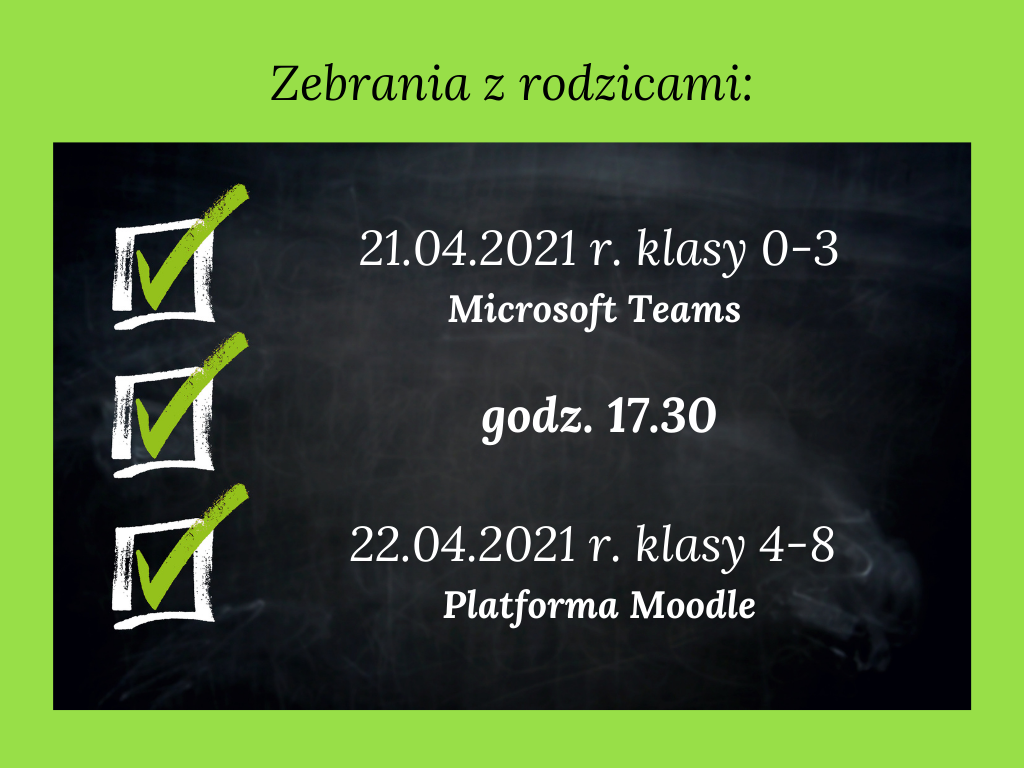 Zebrania klasowe 21-22 kwietnia 2021 r. WYDARZENIA SZKOLNE Zapraszamy do udziału w zebraniach z wychowawcami klas i nauczycielami przedmiotów.
