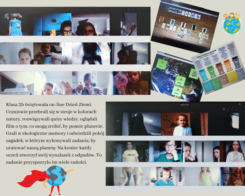 Światowy Dzień Ziemi to największe ekologiczne święto świata. Z tej okazji w klasach 1-3 rozmawialiśmy o sposobach troski o najbliższe środowisko naturalne oraz o zachowaniach proekologicznych. Mówiliśmy, jak w prosty sposób oszczędzać wodę, energię oraz jak dbać o czyste powietrze. Były też piosenki, prace plastyczne i quizy.
