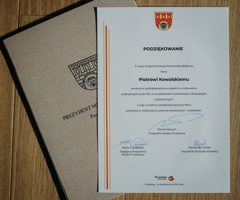 Bardzo miło nam poinformować, że Pan Piotr Kowalski otrzymał wyróżnienie i podziękowanie od Pana Pawła Makucha Prezydenta Miasta Pruszkowa za zaangażowanie i wsparcie pracy naszej szkoły. Serdecznie gratulujemy i liczymy na dalszą owocną współpracę.
