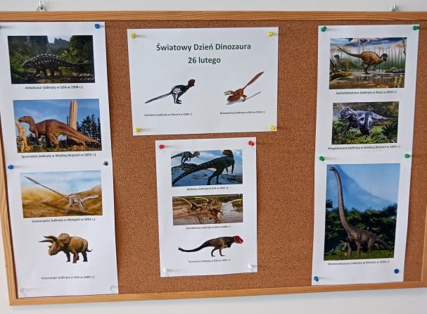 26 lutego obchodzony jest Światowy Dzień Dinozaura. W związku z tym, w bibliotece szkolnej zorganizowano okolicznościową wystawę i gazetkę. Przedstawiono rekonstrukcje różnych gatunków dinozaurów (m.in. megalozaur i iguanodon, odkryte w Wielkiej Brytanii odpowiednio w 1824 i 1825, kulindadromeus znaleziony w Rosji, opisany w 2014, dineobellator, opisany w USA w 2020).
