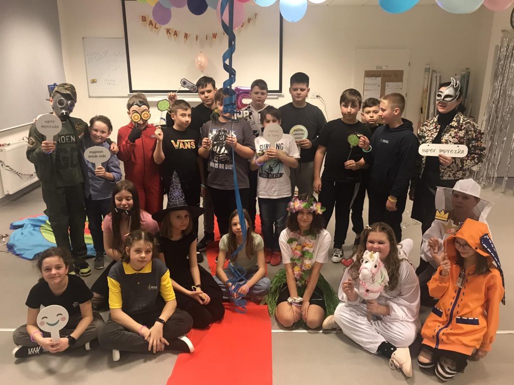 Bal karnawałowy jest atrakcją bardzo lubianą przez dzieci, dostarczającą im wielu przeżyć i radości. Tak też było w dniu 25.02.2022 r. w klasie 5a. Wystrój sali wprowadził radosny nastrój oraz zachęcił wszystkich do zabawy. Na tę wyjątkową okazję zaproszona została animatorka Pani Patrycja, która zachęcała dzieci do tańca z przygotowaną muzyką. Nie zabrakło również konkursów. Podczas zabawy wybrano Królową i Króla Balu. Największy zachwyt wywarł na uczniach pokaz kolorowych świateł i baniek mydlanych. Wspólna zabawa przyniosła wiele radości uczniom, co było głównym celem tego balu.  Szkoda, że następny bal dopiero za rok..