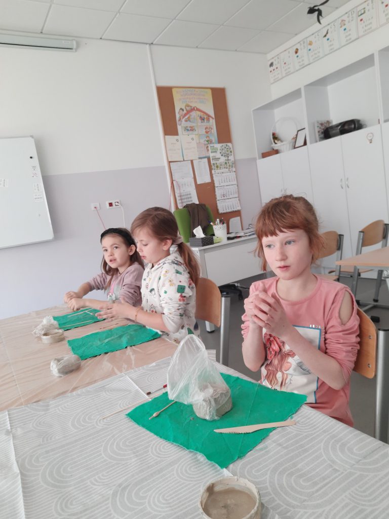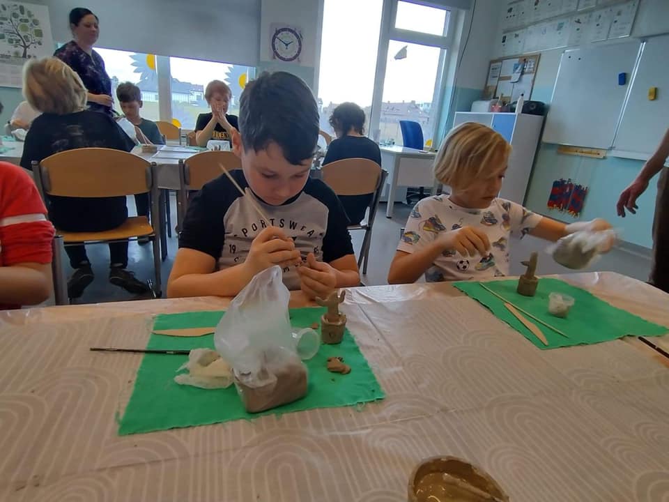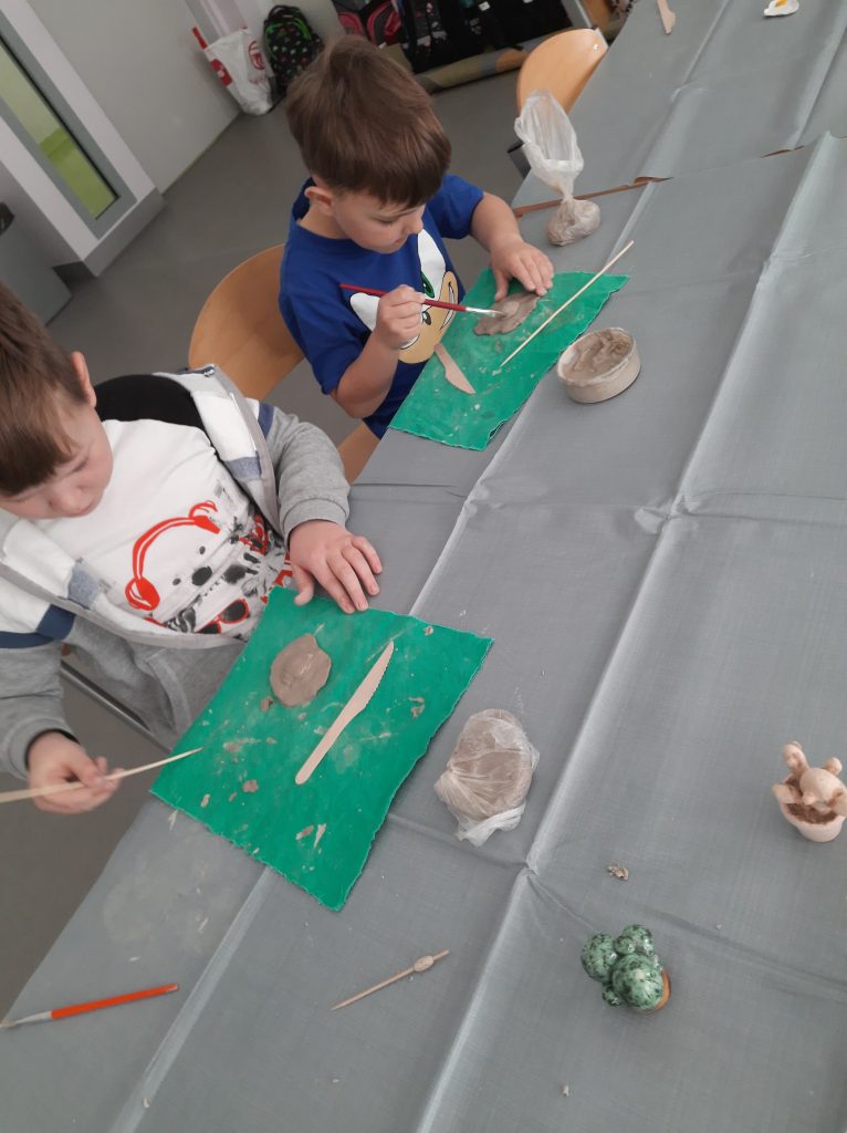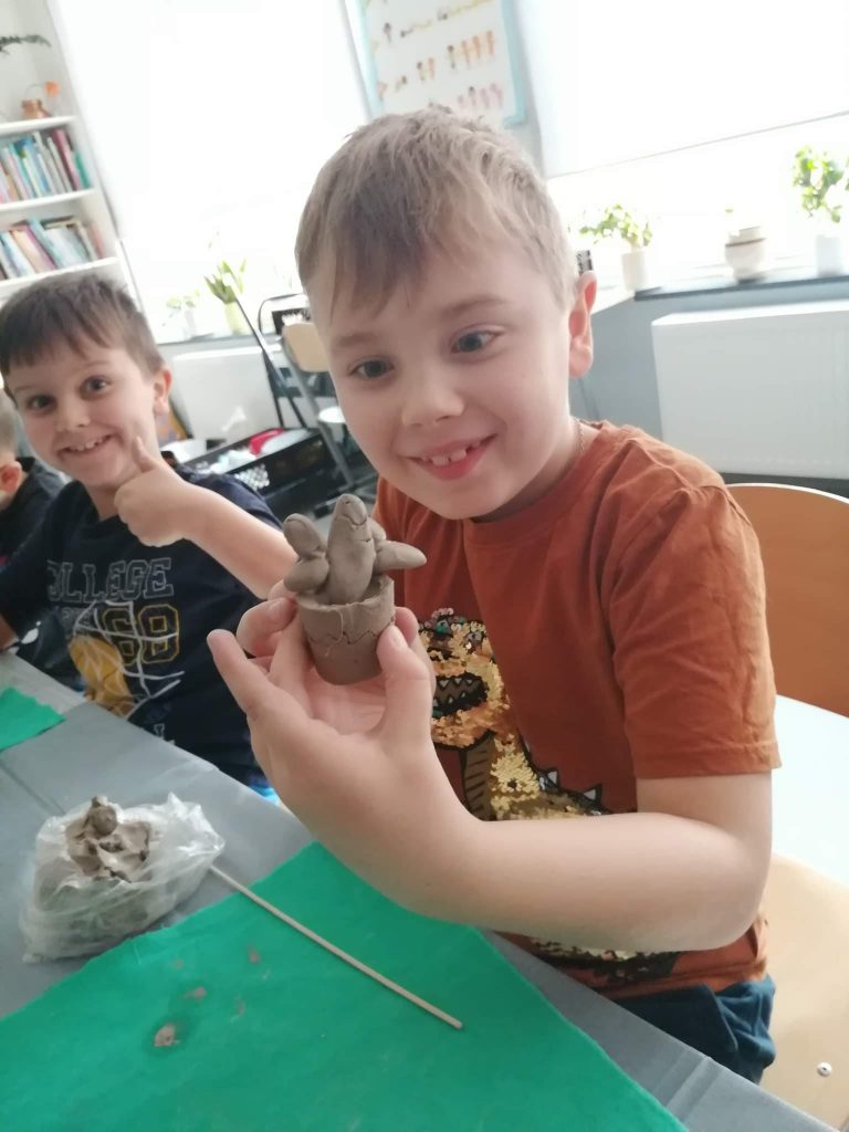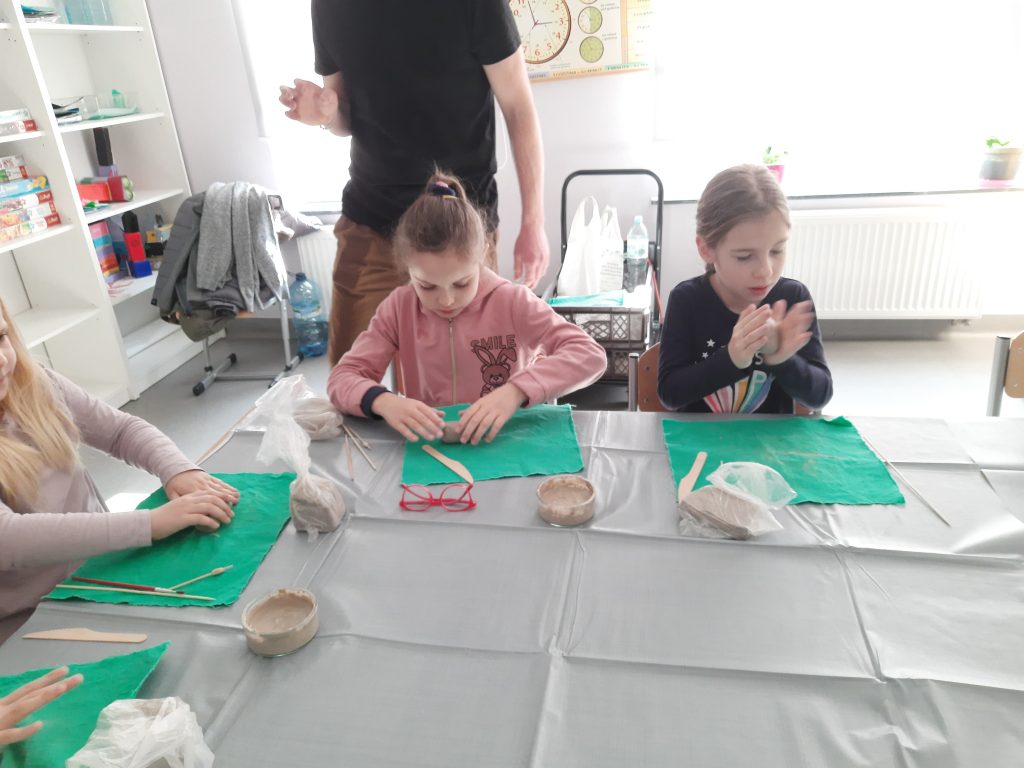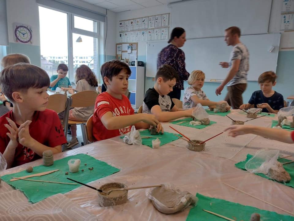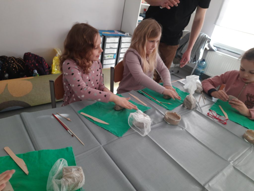 Uczniowie klas młodszych uczestniczyli w warsztatach ceramicznych. Podczas warsztatów ugniatali, lepili, formowali i ściskali glinę, tworząc wspaniałe dzieła sztuki. Kształtowali swoją wyobraźnię, wrażliwość artystyczną, zdolności manualne, ale przede wszystkim dobrze się bawili. Było to pierwsze z dwóch wspaniałych spotkań z gliną. Gdy prace zostaną wypalone, spotkamy się ponownie, by je pomalować.