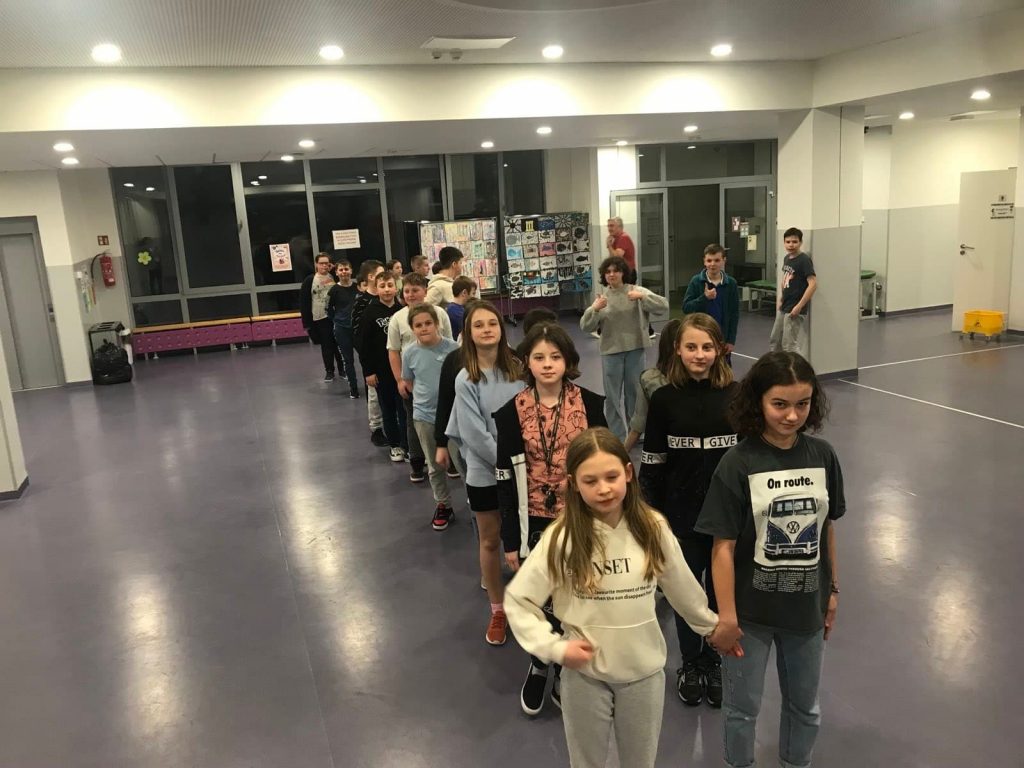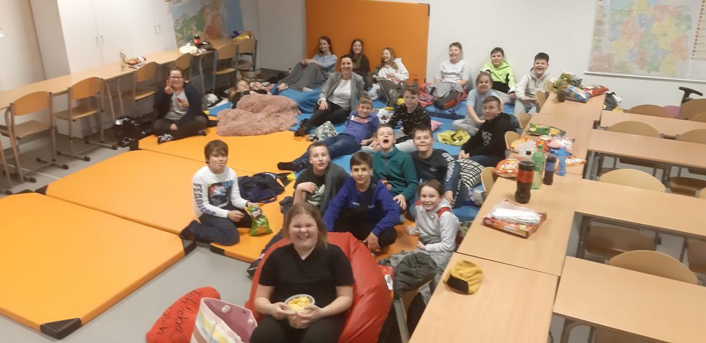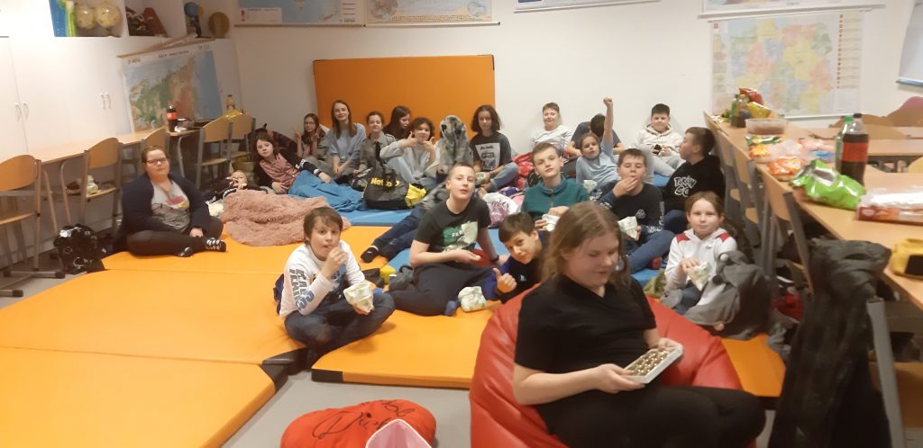 1 kwietnia 2022 r. klasa 5A uczestniczyła pierwszy raz w wieczorze filmowym. Wieczór ten był nie tylko okazją do obejrzenia filmów, ale także był spotkaniem integracyjnym. Uczniowie mieli możliwość spędzenia czasu w szkole w trochę odmienny sposób niż siedzenie w ławkach. Stąd też poduszki, koce, pufy, nie zabrakło też przekąsek… W przerwie między filmami uczniowie zatańczyli wspólny taniec.