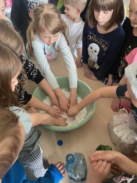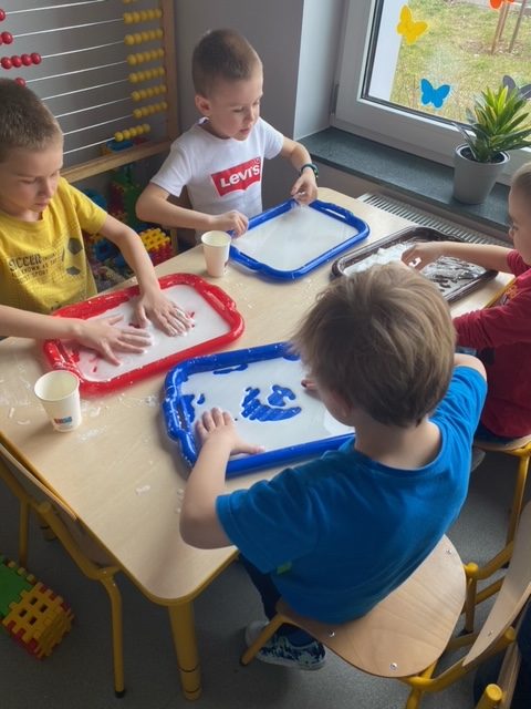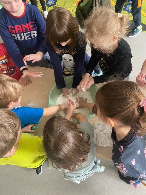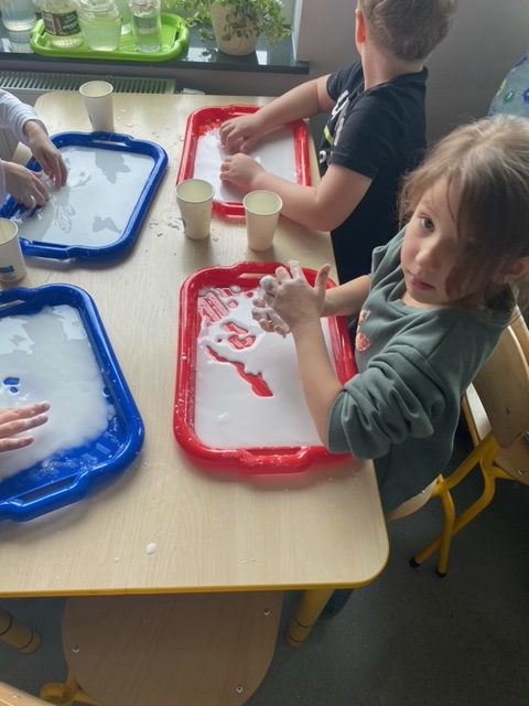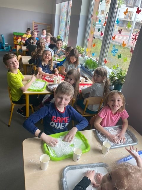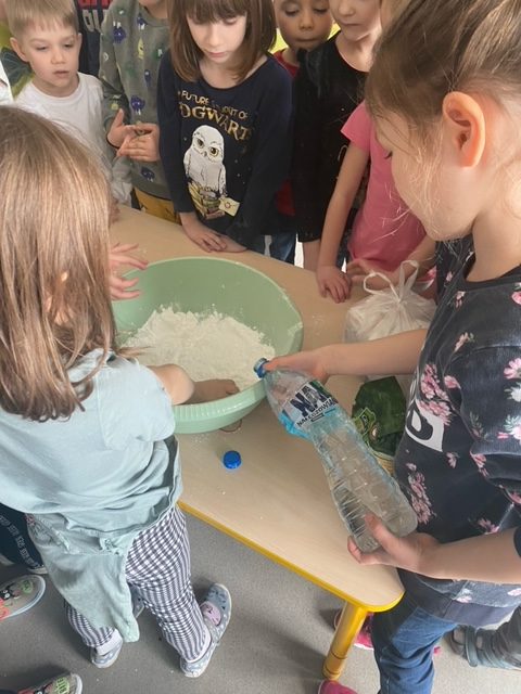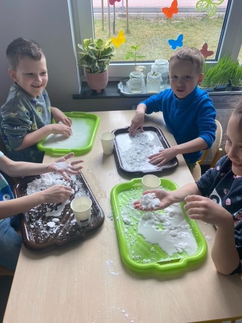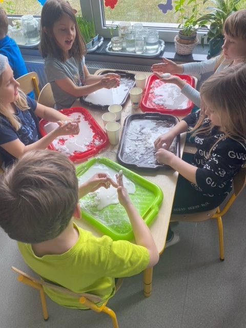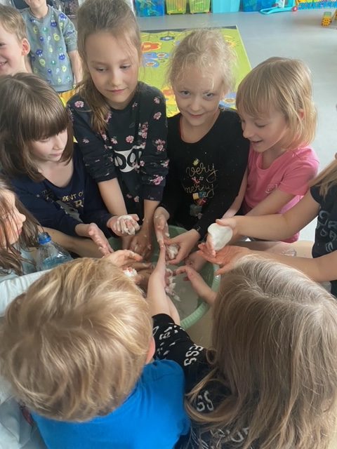 Uczniowie zerówki eksperymentowali i poznali 3 stany skupienia: stały, ciekły i gazowy. Podczas zajęć wykonali doświadczenie, które pokazało, że istnieje coś pomiędzy. Jest to substancja, która czasem zachowuje się jak ciało stałe, a czasem jak ciecz.
