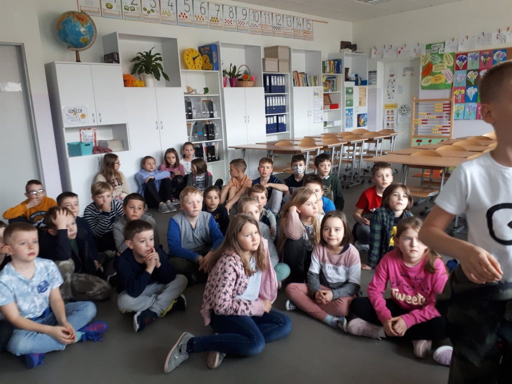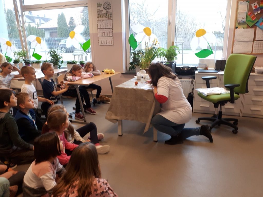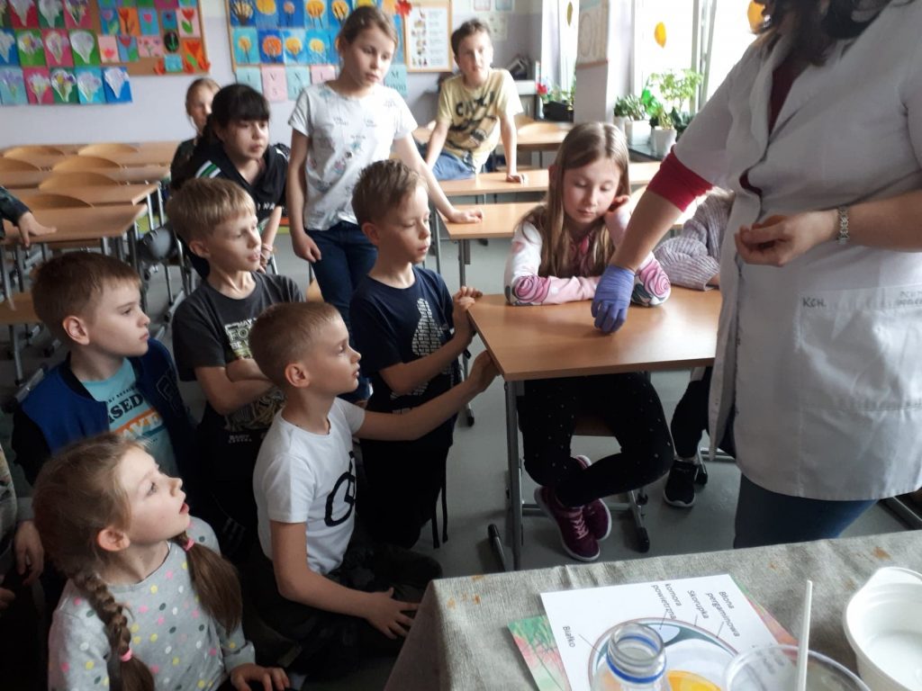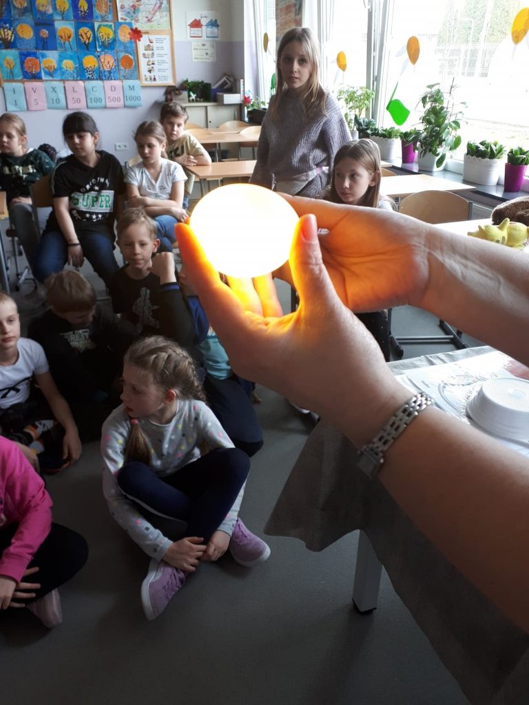 Dnia 05 kwietnia 2022 r. Koło Podróżnika, czyli uczniowie w składzie klasa 3C i 2D, uczestniczyli w warsztatach pt.: „naukowe zabawy z jajkiem”.