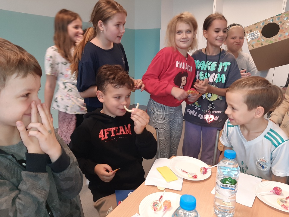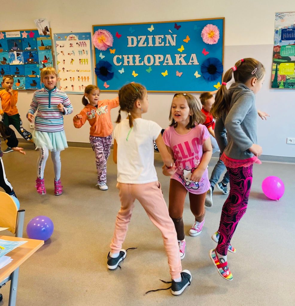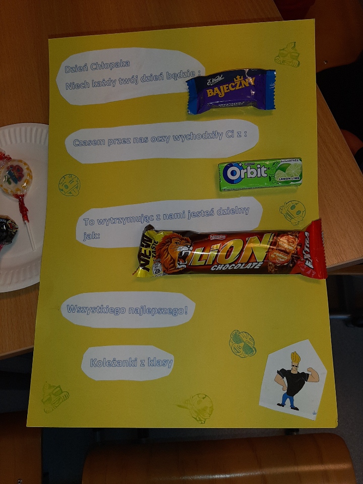 03 października 2022 r. również odbyło się w klasie 4B świętowanie Dnia Chłopaka. Chłopcy otrzymali w prezencie od swoich koleżanek zabawne życzenia i drobne upominki. Rodzice zadbali o poczęstunek, a dziewczynki przygotowały dla kolegów wyzwania: wykonywali oni wylosowane zadania i rozpoznawali przedmioty za pomocą dotyku. Za dobrze wykonane zadanie, chłopcy otrzymywali lizaki. Jeśli ktoś jednak nie podołał wyzwaniu, musiał zjeść kawałek cytryny!