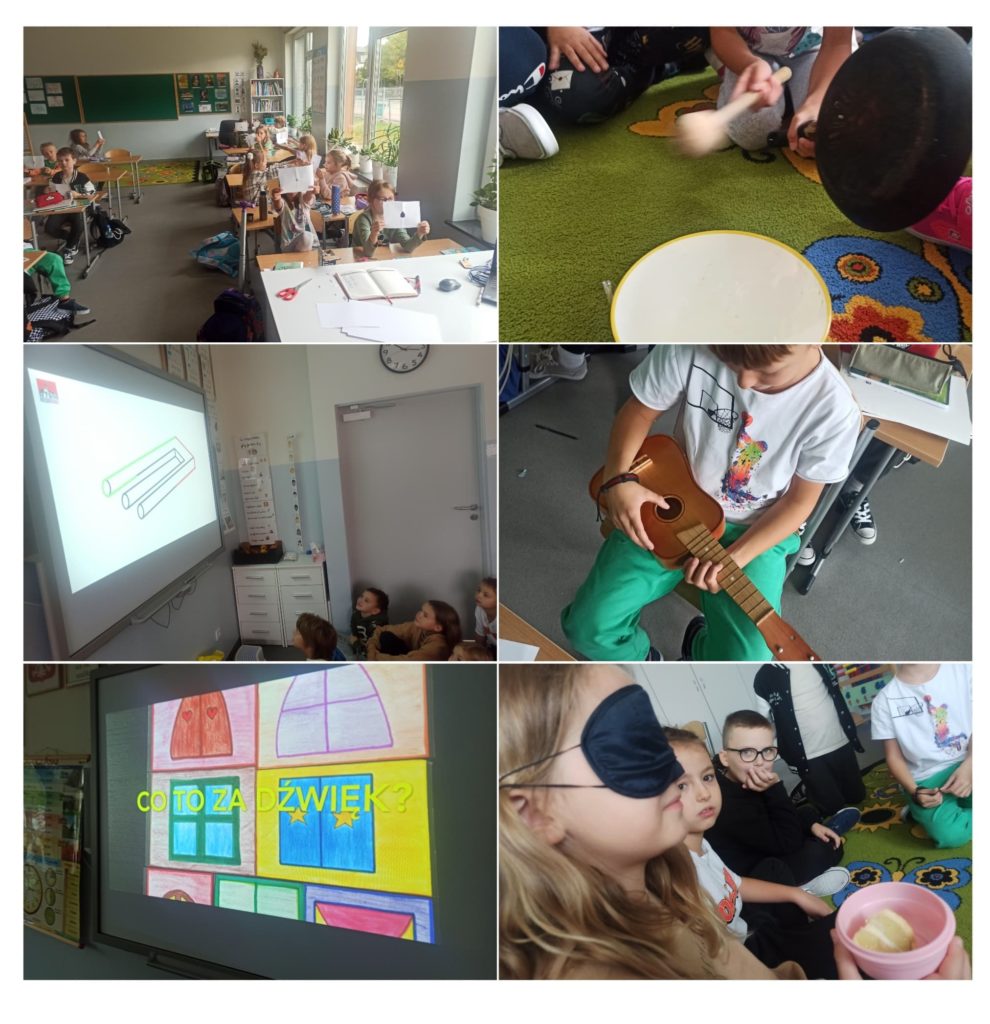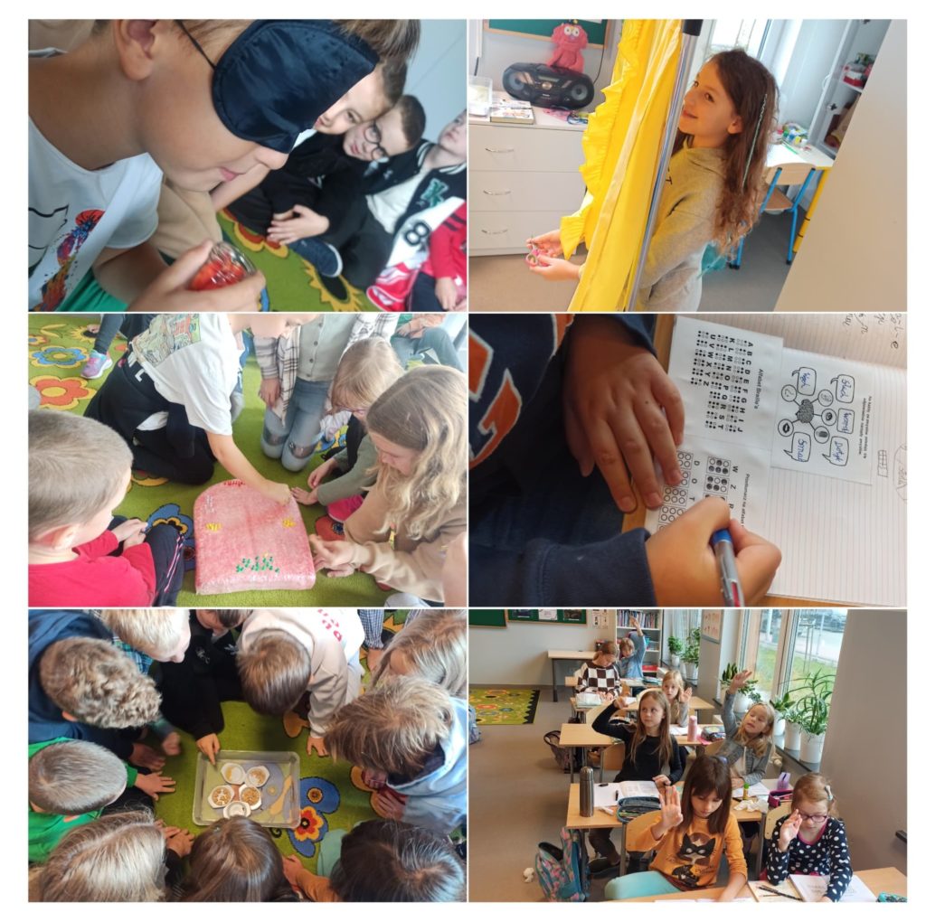 W klasie 2B odbyły się niezwykle lekcje – rozmawialiśmy o zmysłach. Uczniowie sprawdzali, które oko mają dominujące, przekonali się, jak nasz wzrok potrafi oszukiwać, ogadywali różne odgłosy, obserwowali skaczący ryż i przekonali się, że dźwięk to fala. Poznali zasadę wysokiego i niskiego dźwięku. Zgadywali, co jak pachnie. Dowiedzieli się, czym są kubki smakowe i sami „przyczepiali” je do ogromnego języka. Zapoznali się z językiem Migowym i alfabetem Braille’a. Kodowali informacje brajlem i uczyli się migać swoje imię. Zachwytów na tych lekcjach było co niemiara.