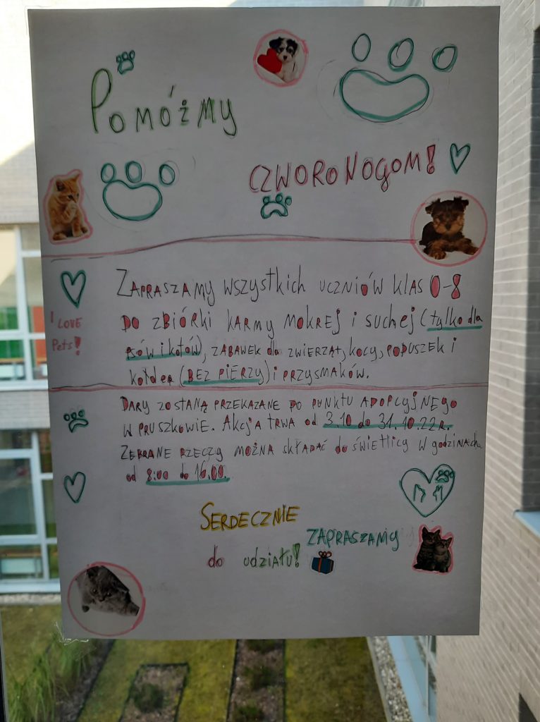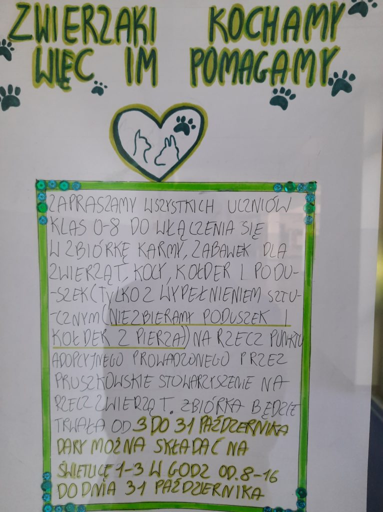 Zapraszamy wszystkich uczniów z klas 0-8 do włączenia się w zbiórkę karmy, zabawek dla zwierząt, koców, kołder i poduszek (tylko z wypełnieniem sztucznym, uwaga – nie zbieramy poduszek i kołder z pierza) na rzecz zwierząt z Punktu Adopcyjnego prowadzonego przez Pruszkowskie Stowarzyszenie Na Rzecz Zwierząt. Zbiórka będzie trwała od 3 do 31 października 2022.