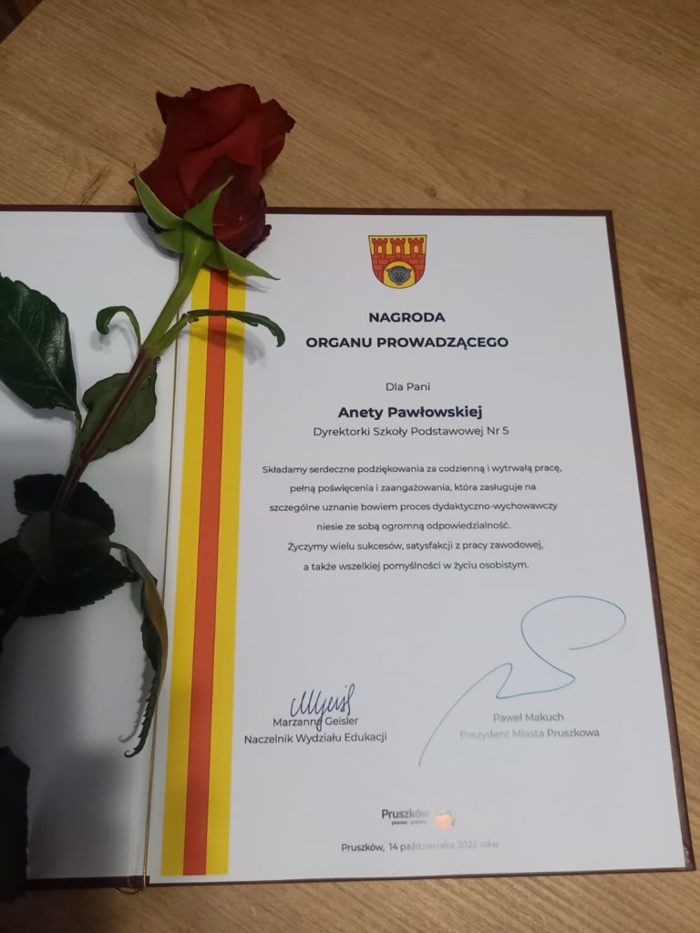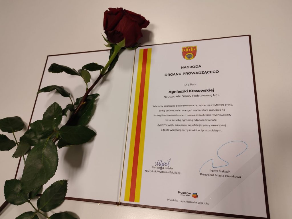 Miło nam poinformować, że wśród osób wyróżnionych nagrodami znalazły się Pani Aneta Pawłowska, Dyrektor Szkoły Podstawowej nr 5 oraz nauczyciele naszej szkoły Pani Katarzyna Dąbrowska oraz Pani Agnieszka Krasowska. Serdecznie gratulujemy i życzymy dalszych sukcesów!
