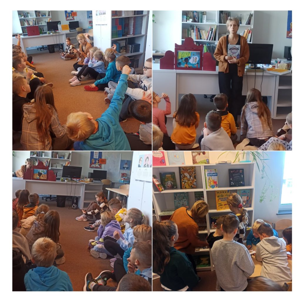 12 października 2022 r. uczniowie klasy 2B zawitali do szkolnej biblioteki. Pani Agnieszka Makarewicz – nauczycielka biblioteki, zaprezentowała uczniom przy pomocy teatrzyku kamishibai bajkę o oszczędzaniu wody pt.: „Po drugiej stronie gór”. Opowiadała ona historię dziewczynki o imieniu Aisza, która żyła w rejonie, gdzie brakowało wody. Uczniowie po wysłuchaniu bajki zastanawiali się w jaki sposób sami mogą ją oszczędzać. Snuli również opowieści o tym, jak wyglądałyby ich domy, gdyby przez dwa tygodnie nie było wody. Uczniowie mieli możliwość obejrzenia różnorodnych książek o tematyce ekologicznej, znajdujących się w zbiorach biblioteki. Mamy nadzieję, że zajęcia zachęciły młodych czytelników do pogłębiania wiedzy w tym temacie.