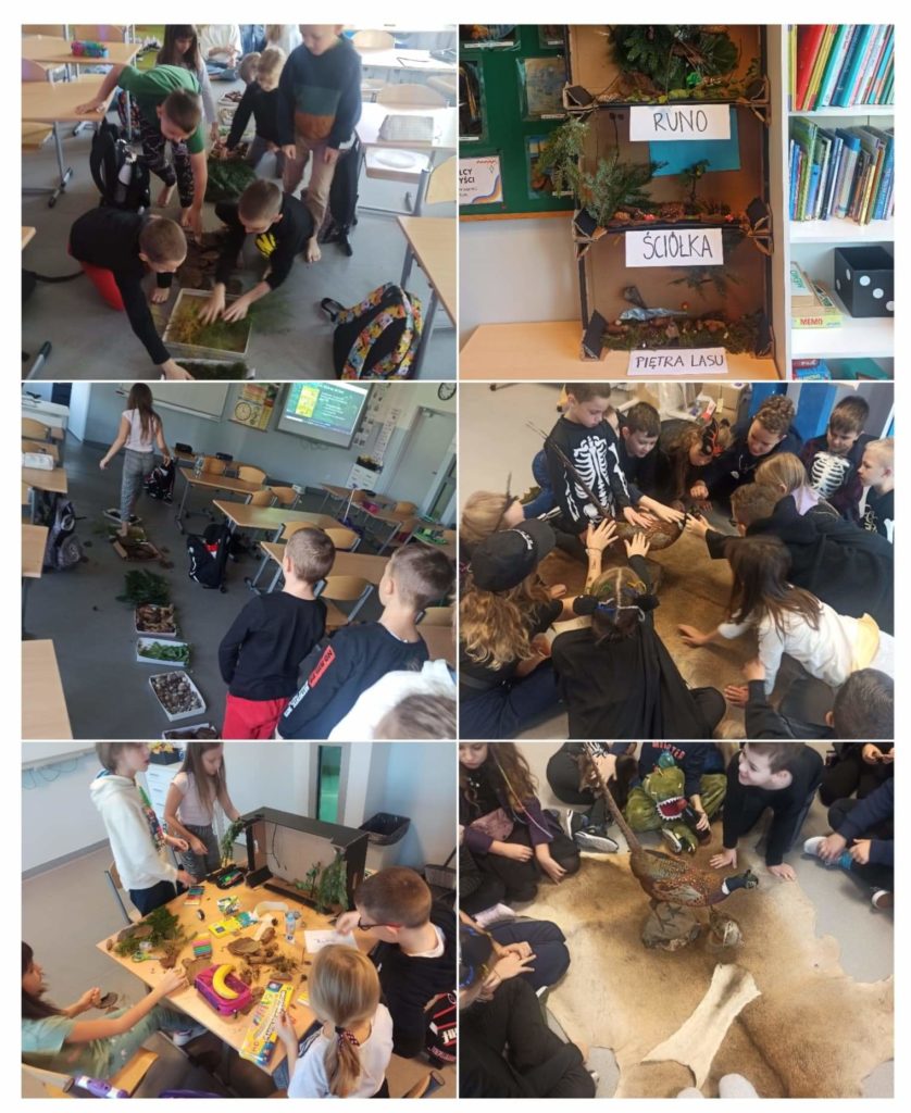 Omawiając temat lasu wiele niezwykłych doznań stracilibyśmy, gdybyśmy opierali się tylko na wiadomościach teoretycznych. Mając powyższe na uwadze, uczniowie klasy 2B najpierw zapoznali się z darami lasu, które dotykali i wąchali. Następnie stworzyli ścieżkę sensoryczną, po której kroczyli bosymi stopami. Doznania były bardzo wyraźne, a po reakcjach uczniów wnioskuję, że również bardzo przyjemne. Uczniowie mieli również okazję zobaczyć i dotknąć skór zwierząt (nie tylko tych, które żyją w lesie). Ćwicząc umiejętność pracy w grupach stworzyli piękną pracę obrazującą piętra lasu.