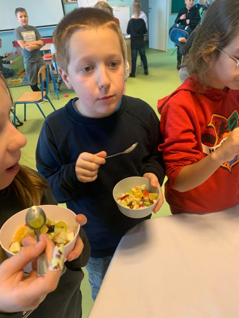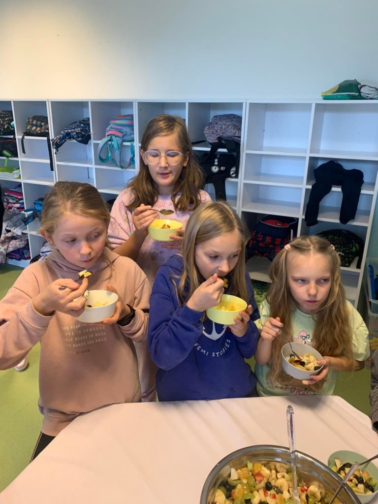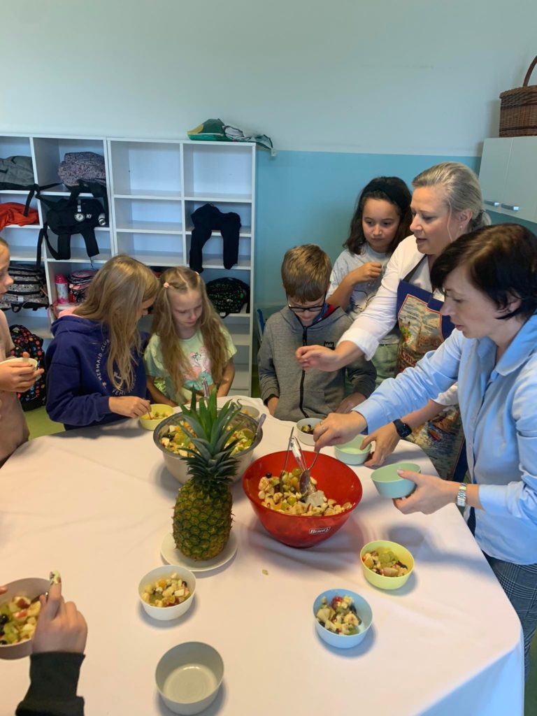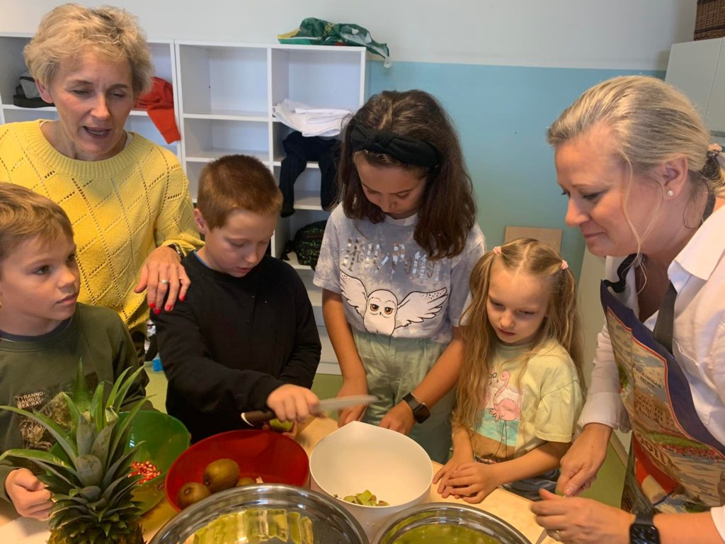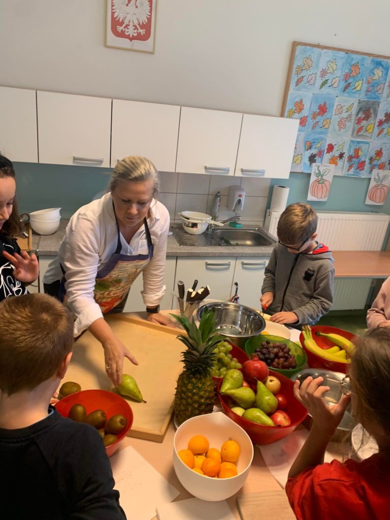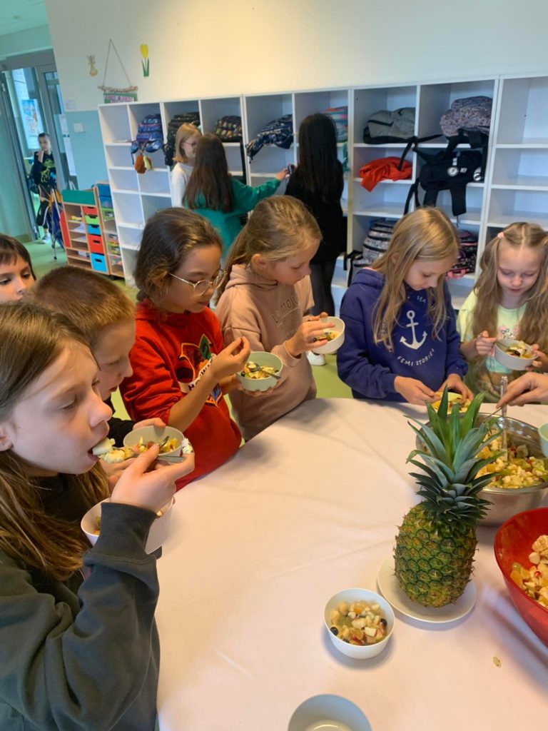 19 października 2022 r. w naszej świetlicy po raz kolejny odbyły się zajęcia kółka kulinarnego. W czasie dzisiejszego spotkania, dzieci pod nadzorem wychowawców przygotowywały sałatkę owocową, która wszystkim dzieciom bardzo smakowała. Przyrządzanie takiej kolorowej i pełnej witamin sałatki przyniosło dzieciom wiele radości oraz zachęciło do zdrowego odżywiania się. Sprawne przygotowanie naszych smakołyków umożliwiły nam sprzęty zakupione dzięki uczestnictwu szkoły w programie „Laboratorium Przyszłości”