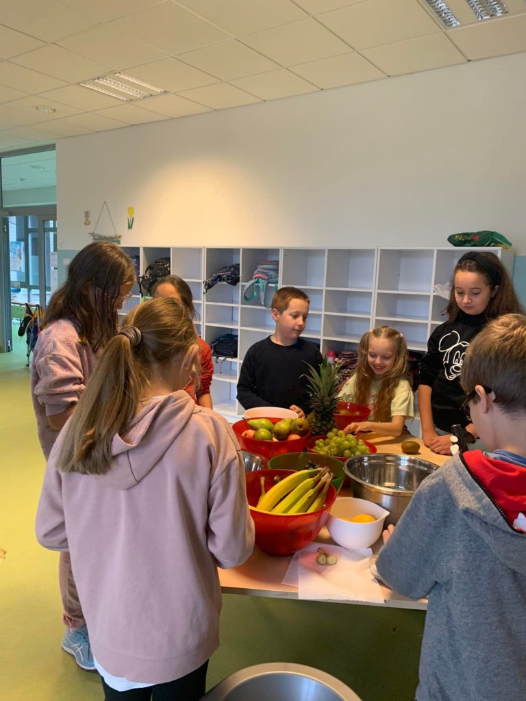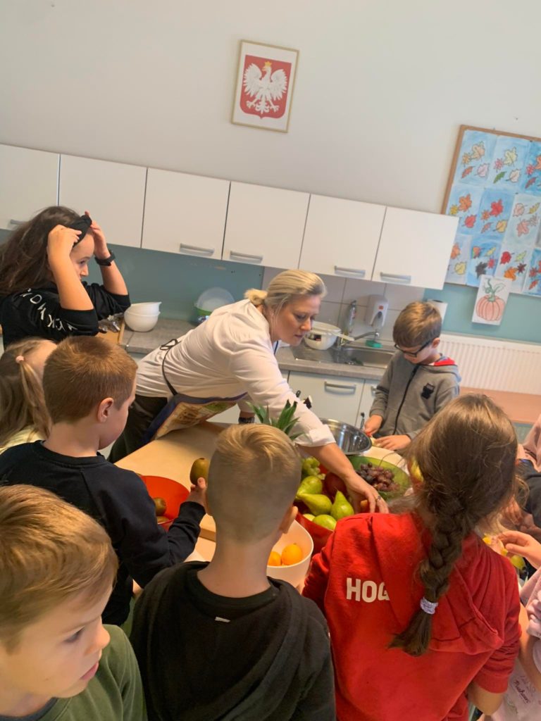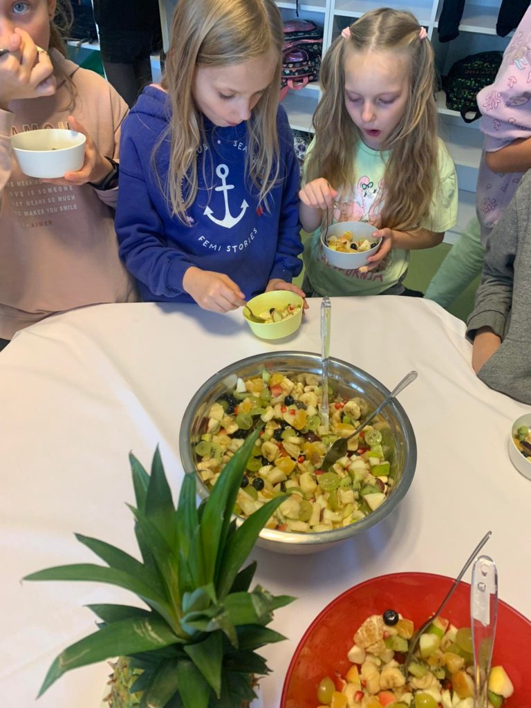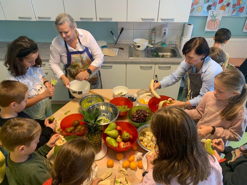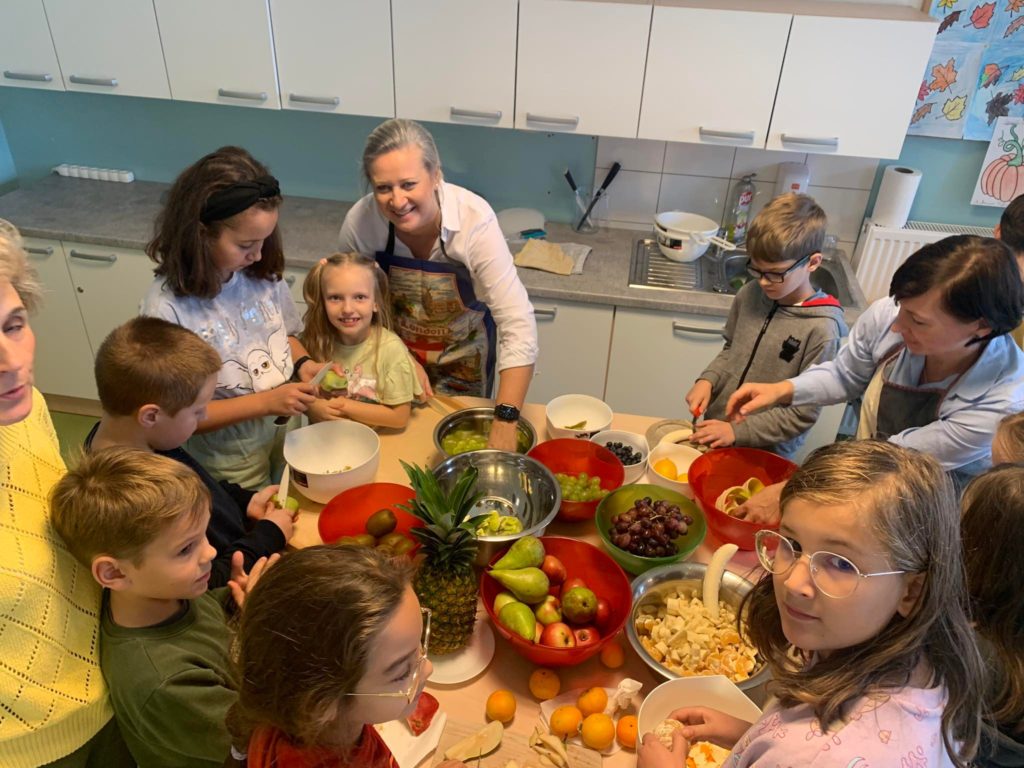 19 października 2022 r. w naszej świetlicy po raz kolejny odbyły się zajęcia kółka kulinarnego. W czasie dzisiejszego spotkania, dzieci pod nadzorem wychowawców przygotowywały sałatkę owocową, która wszystkim dzieciom bardzo smakowała. Przyrządzanie takiej kolorowej i pełnej witamin sałatki przyniosło dzieciom wiele radości oraz zachęciło do zdrowego odżywiania się. Sprawne przygotowanie naszych smakołyków umożliwiły nam sprzęty zakupione dzięki uczestnictwu szkoły w programie „Laboratorium Przyszłości”