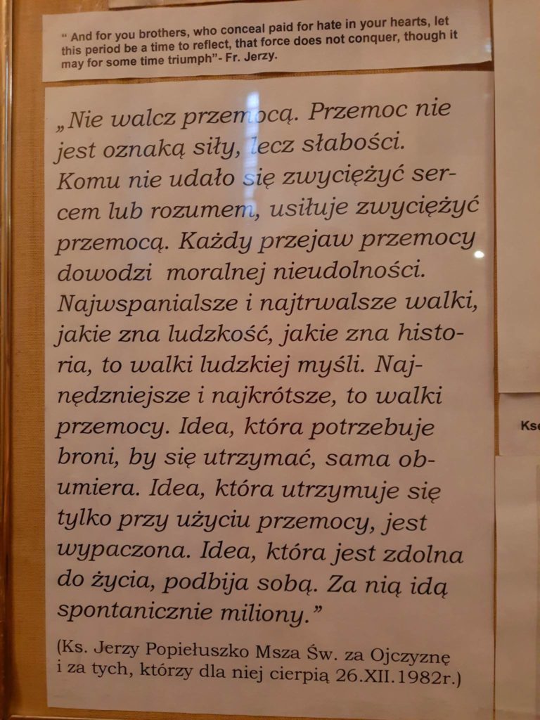 Świadkiem i przewodnikiem pielgrzymki był pan Adam Nowosad świadek w procesie beatyfikacyjnym oraz przyjaciel ks. Jerzego. Podczas zwiedzania muzeum poświęconego męczennikowi uczniowie widzieli kaplicę z sutanną męczennika oraz modlili się, w tym wyjątkowym miejscu, w intencji społeczności szkolnej i rodzin