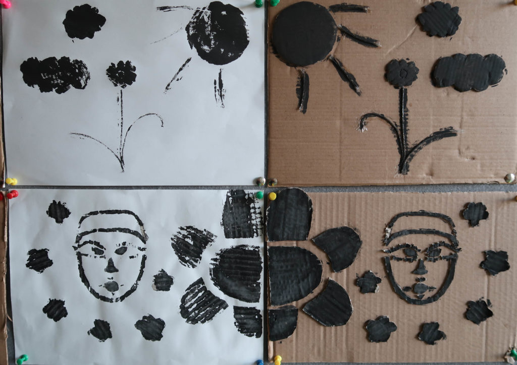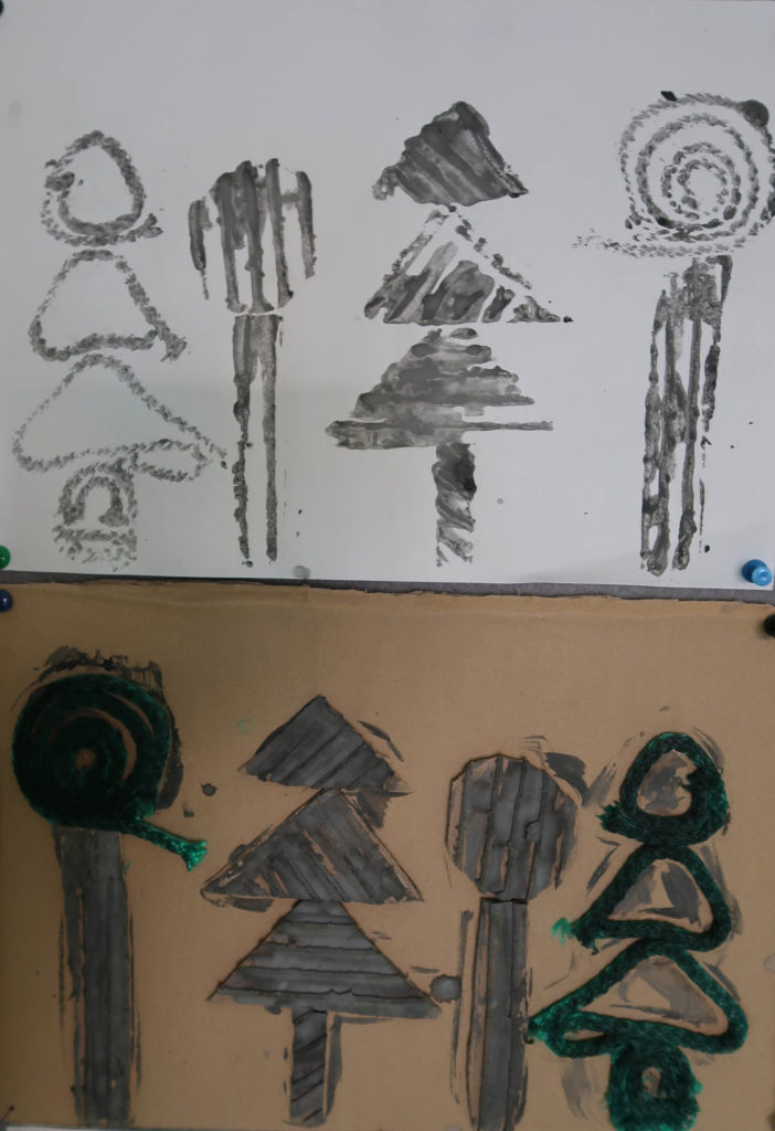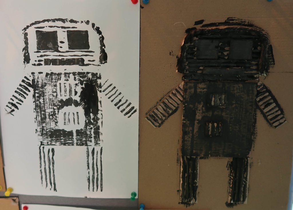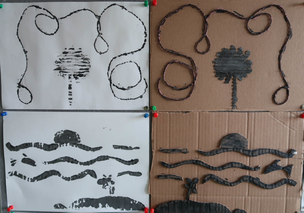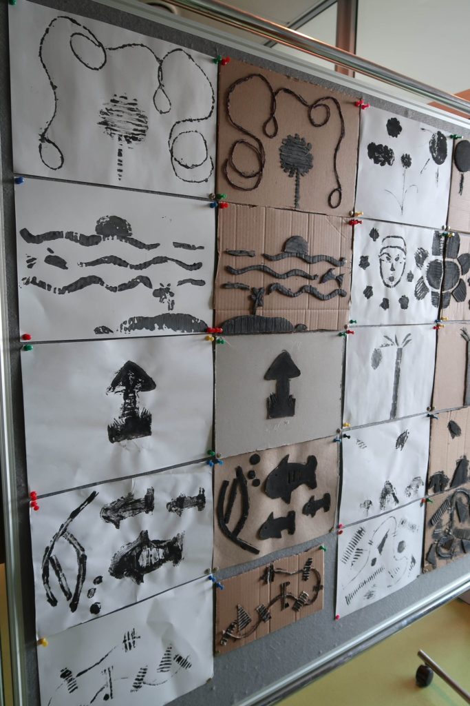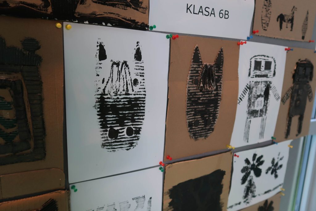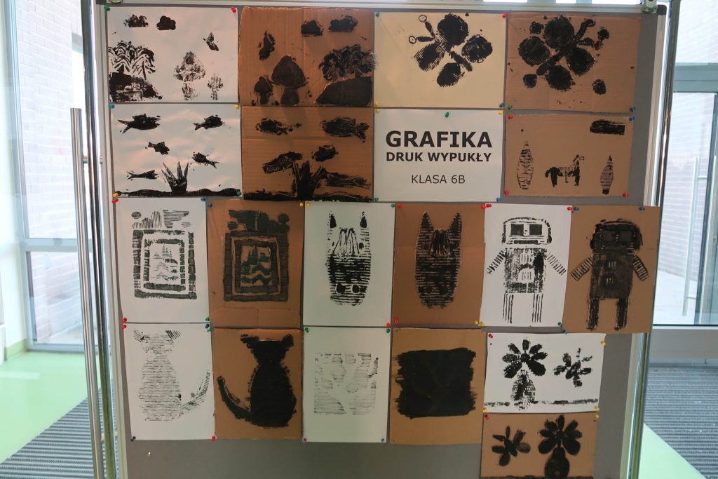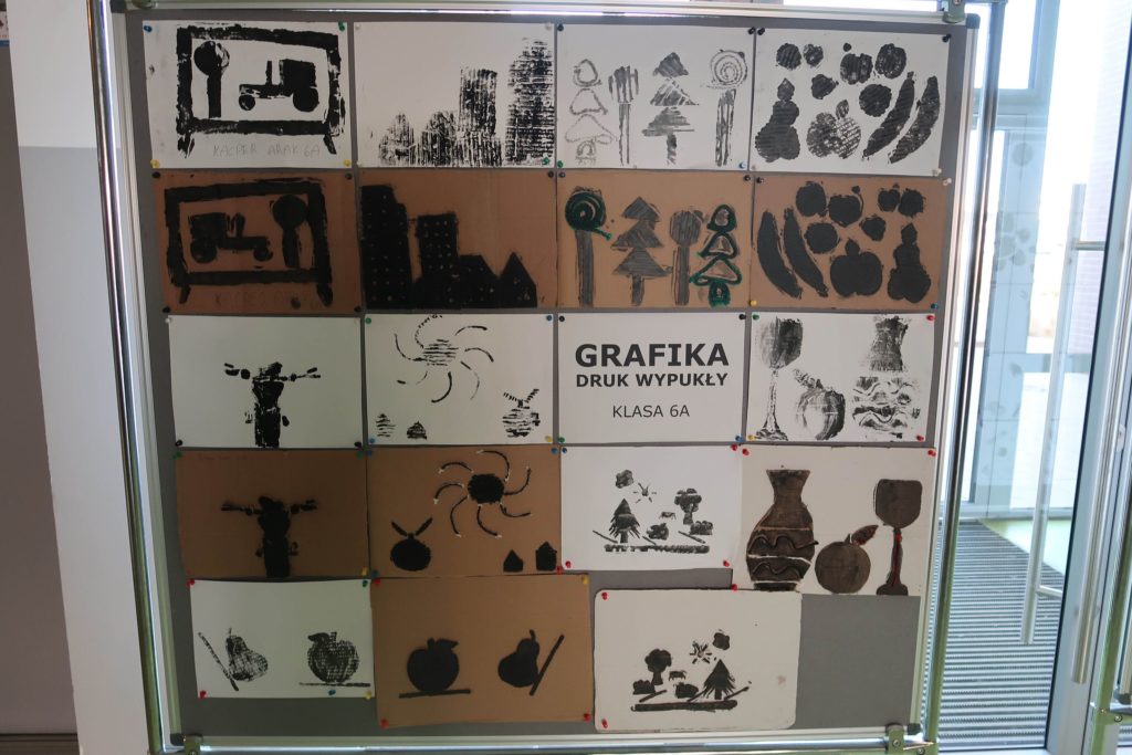 Uczniowie klasy 6A i 6B na lekcji plastyki wykonali grafiki w technice druku wypukłego. Najpierw zostały przygotowane matryce z kartonu i elementów naklejonych na niego. Następnie uczniowie pokryli elementy wypukłe czarną farbą. Później przyłożyli papier do matrycy, dociskając go do wyciętej kompozycji w miejscach styku i wykonali odbitki.