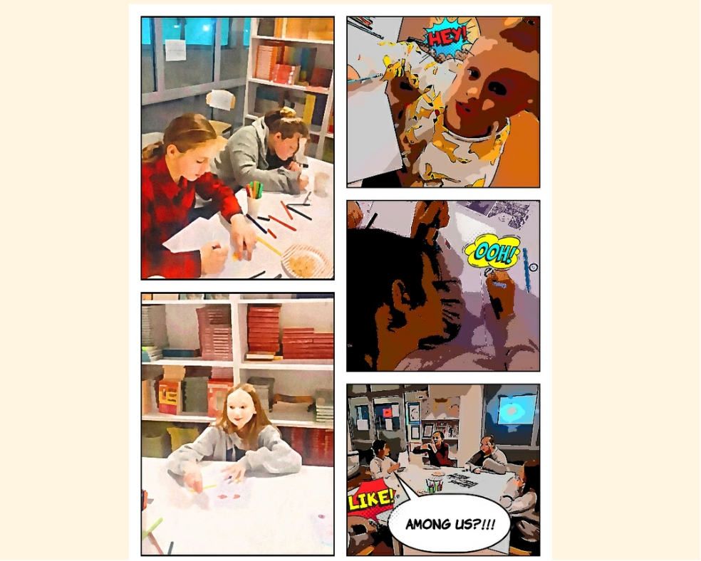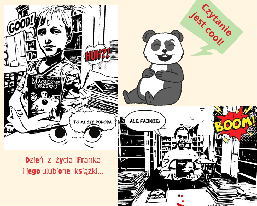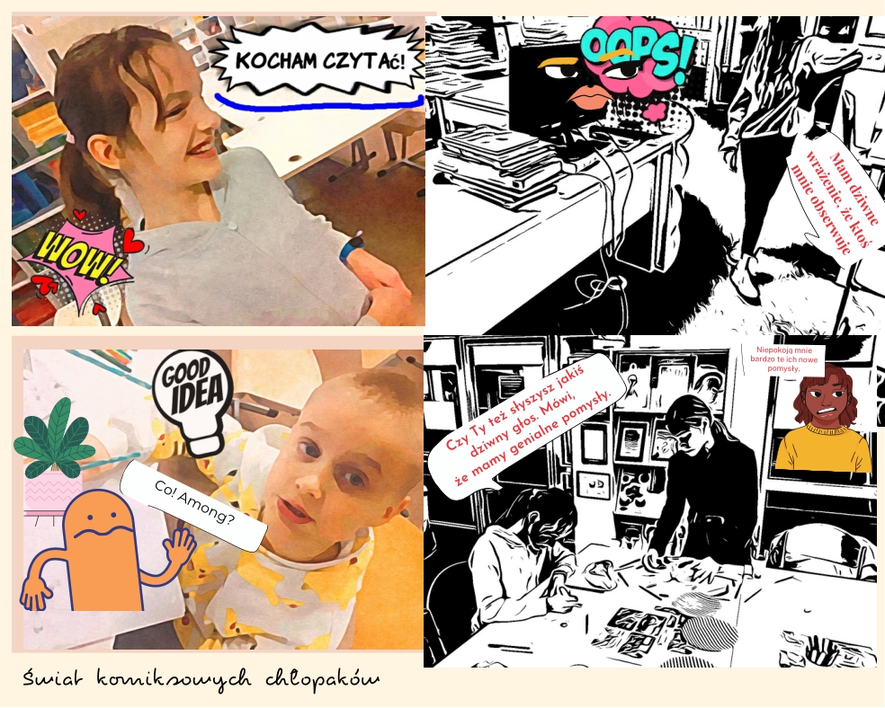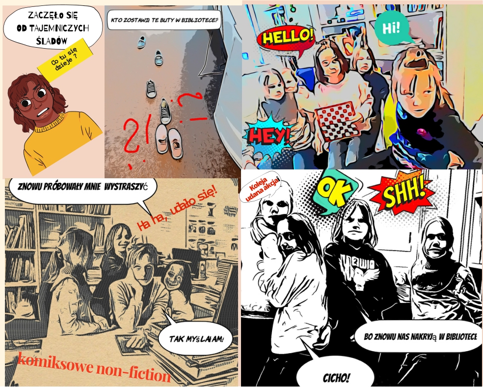 Kolejne spotkanie Szkolnego Koła Bibliotecznego, które odbyło się w czwartek, 24 listopada zaowocowało powstaniem krótkich komiksowych opowieści. Proces ich tworzenia był bardzo przyjemny i zarazem kreatywny. Podczas wspólnej zabawy zrobiliśmy kilkanaście zdjęć, które przeszły metamorfozę w różnych aplikacjach. Następnie uczestnicy „budowali” nowy obraz oraz fabułę, korzystając zarówno z gotowych elementów, a także tworząc nowe ich wersje. Okazuje się, że komiks, to bardzo lubiana przez uczniów forma literacka i ma sporą grupę odbiorców w naszej szkole, co wyraźnie widać w wypożyczeniach bibliotecznych.