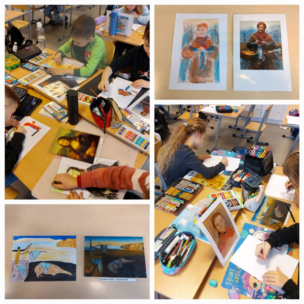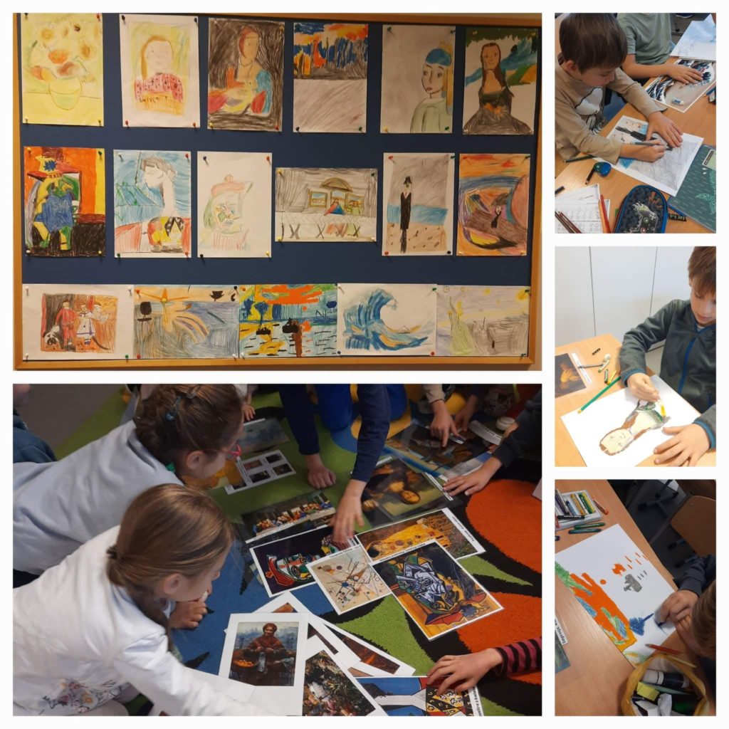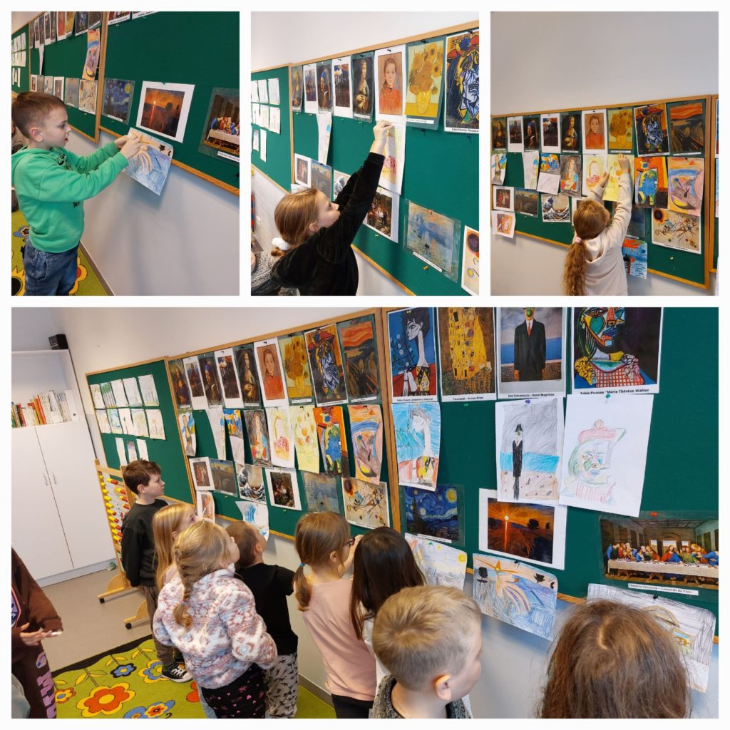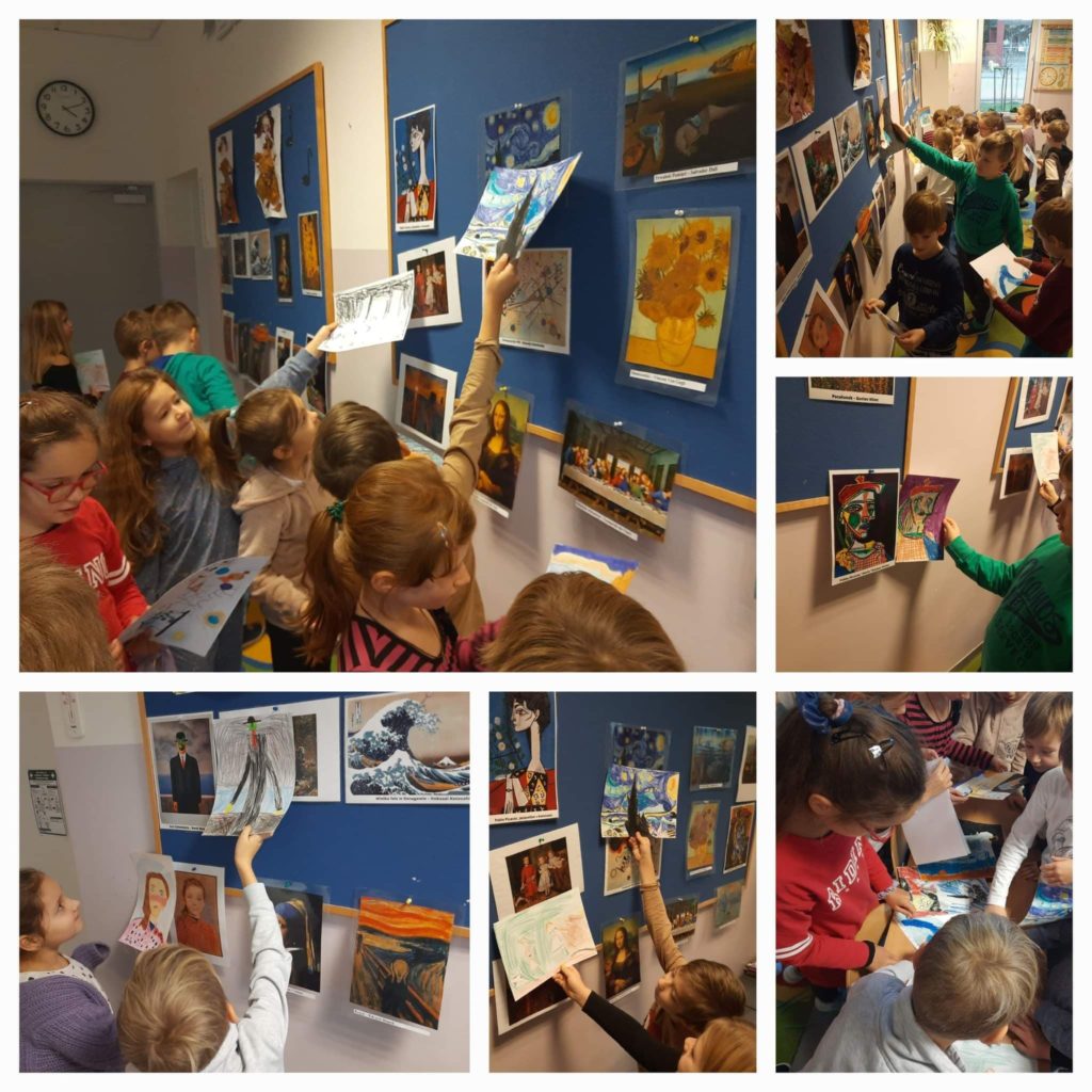 W ramach projektu „Zabawy sztuką” klasy 2A i 2B rzuciły sobie nawzajem wyzwanie. Zadanie nawiązywało oczywiście do świata sztuki. Uczniowie w swoich klasach najpierw na podstawie słynnych dziel sztuki kopiowali obrazy słynnych malarzy. Następnie wymienili się swoimi pracami i odgadywali, które obrazy malowali ich koledzy. Nie było problemu z przyporządkowaniem dzieł do kopii. W salach powstały piękne galerie dzieł sztuki.