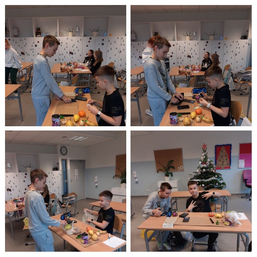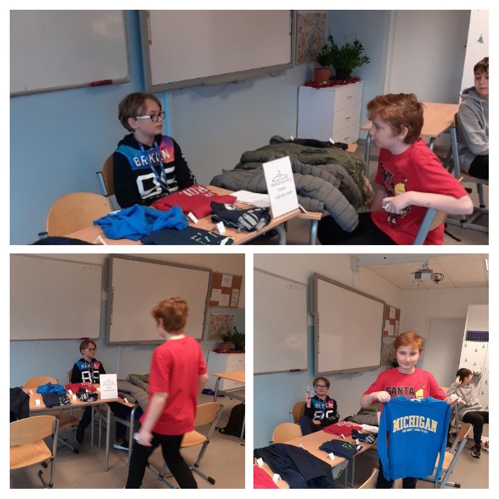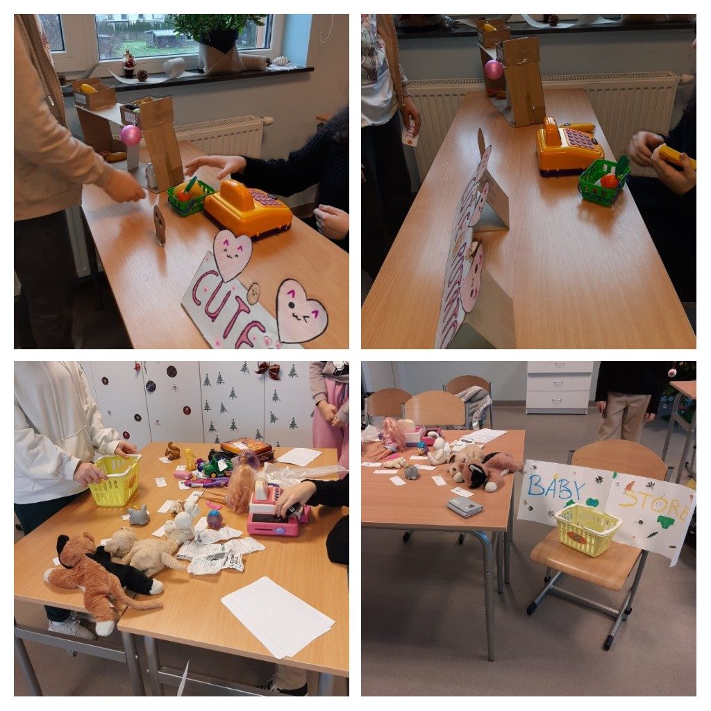 Uczniowie klasy 6B, gr. 1 pracowali wczoraj na lekcji języka angielskiego metodą projektu. Uczniowie, pracując w parach, mieli za zadanie przygotować sklep (szyld, asortyment, ceny), a następnie wcielić się w rolę klienta/sprzedawcy i odegrać scenkę. Uczniowie wykazali się zaangażowaniem i dużą pomysłowością w wymyślaniu asortymentu, wyposażenia sklepów i dialogów. Wszyscy dobrze się bawili, a jedna para podeszła do zadania na wesoło przygotowując skecz, którego bohaterami byli sprzedawca obnośny i turysta. Cel projektu, którym było utrwalenie słownictwa związanego z zakupami, został osiągnięty!