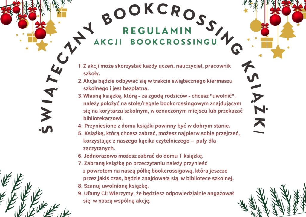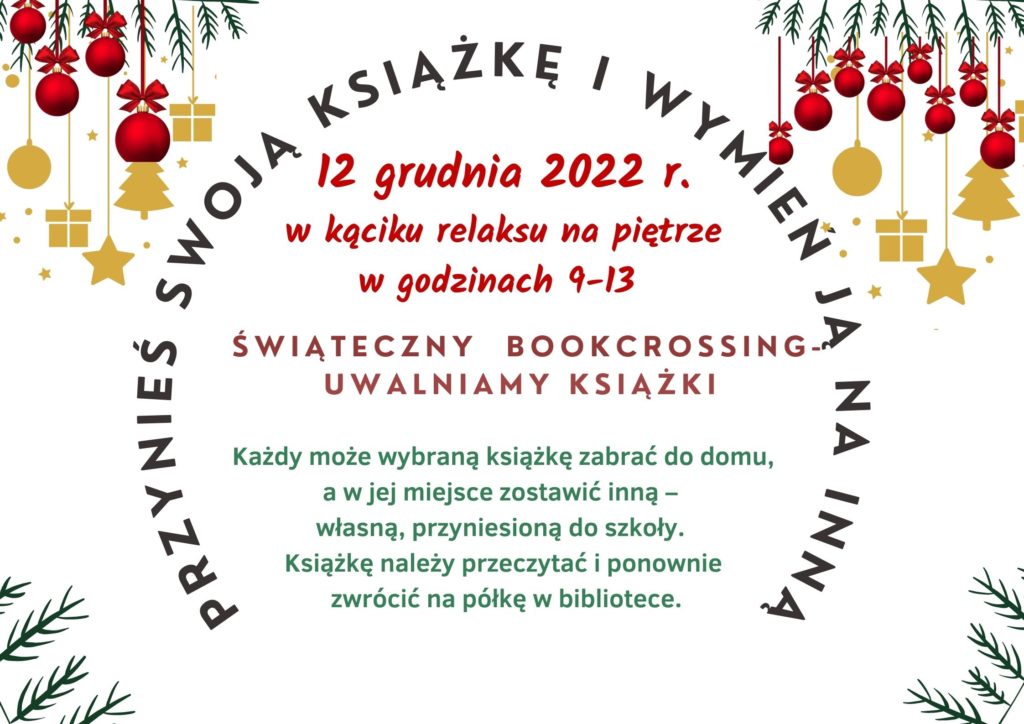 W naszej szkole rozpoczynamy akcję „Wędrująca książka”, czyli bookcrossing, który  jest formą ruchomej biblioteki i ma na celu popularyzację czytelnictwa. Bookcrossing polega na zostawianiu przeczytanych książek w miejscach w tym celu przygotowanych, na tzw. półkach bookcrossingowych po to, by znalazca mógł je zabrać do domu, przeczytać i przekazać dalej. W naszej szkole akcję bookcrossingu rozpoczynamy, w dniu szkolnego kiermaszu bożonarodzeniowego, czyli 12 grudnia 2022 r., ale będzie ona kontynuowana w bibliotece szkolnej jeszcze przez jakiś czas. Każdy może wziąć wybraną książkę, a w jej miejsce zostawić inną – przyniesioną z domu.  Należy ją przeczytać, a następnie z powrotem uwolnić (przekazać dalej) do obiegu. Zachęcamy Was do uwalniania swoich książek – za zgodą rodziców. Dzielenie się książką z innymi jest lepsze od jej posiadania, ponieważ ta leżąca bezczynnie na półce jest tylko ozdobą, jest martwa, może tak stać latami, nikomu nie przynosi pożytku. Nabiera życia wówczas, gdy jest czytana, gdy jest w ręku czytelnika, dlatego dajmy szansę innym na jej przeczytanie.