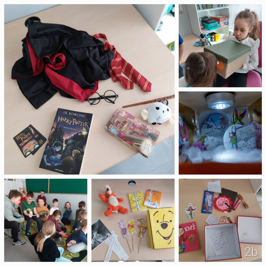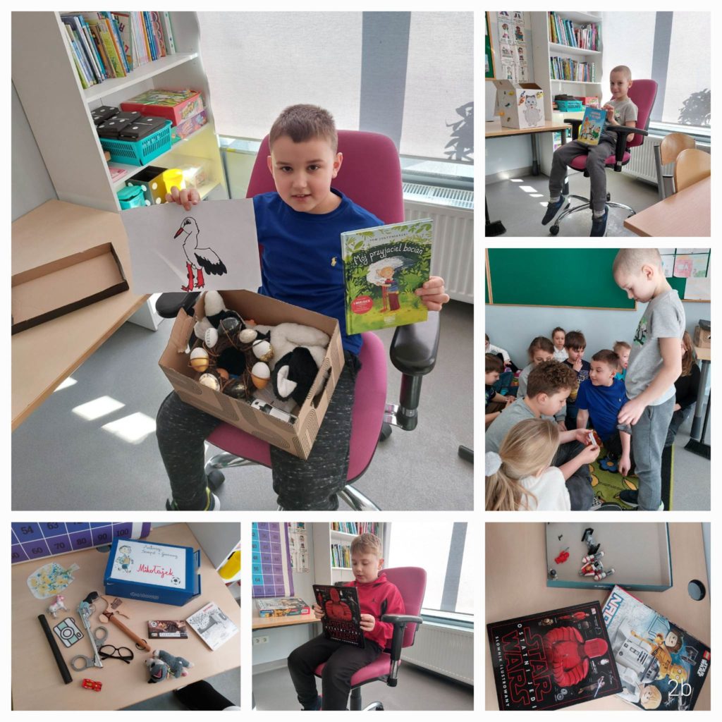 Wszyscy wiemy, że czytanie książek jest bardzo ważne. Kto zachęci najskuteczniej do tego? Oczywiście rówieśnicy. W duchu tej myśli uczniowie klasy 2B mieli za zadanie wybrać dowolną książkę, przeczytać ją, a następnie stworzyć „książkę w pudełku”. Do samodzielnie ozdobionego pudełka dzieci miały włożyć przedmioty, które kojarzą im się z treścią książki. Każdy uczeń miał swój czas na przedstawienie książki i tego, co zgromadził w pudle. Pomysły były po wielokroć zaskakujące, a wybory książek nieoczywiste. Uczniowie przygotowywali dla swych koleżanek i kolegów również quizy, zagadki, czy kolorowanki dotyczące swoich lektur. Był to dla nich również wspaniały trening wystąpień publicznych.