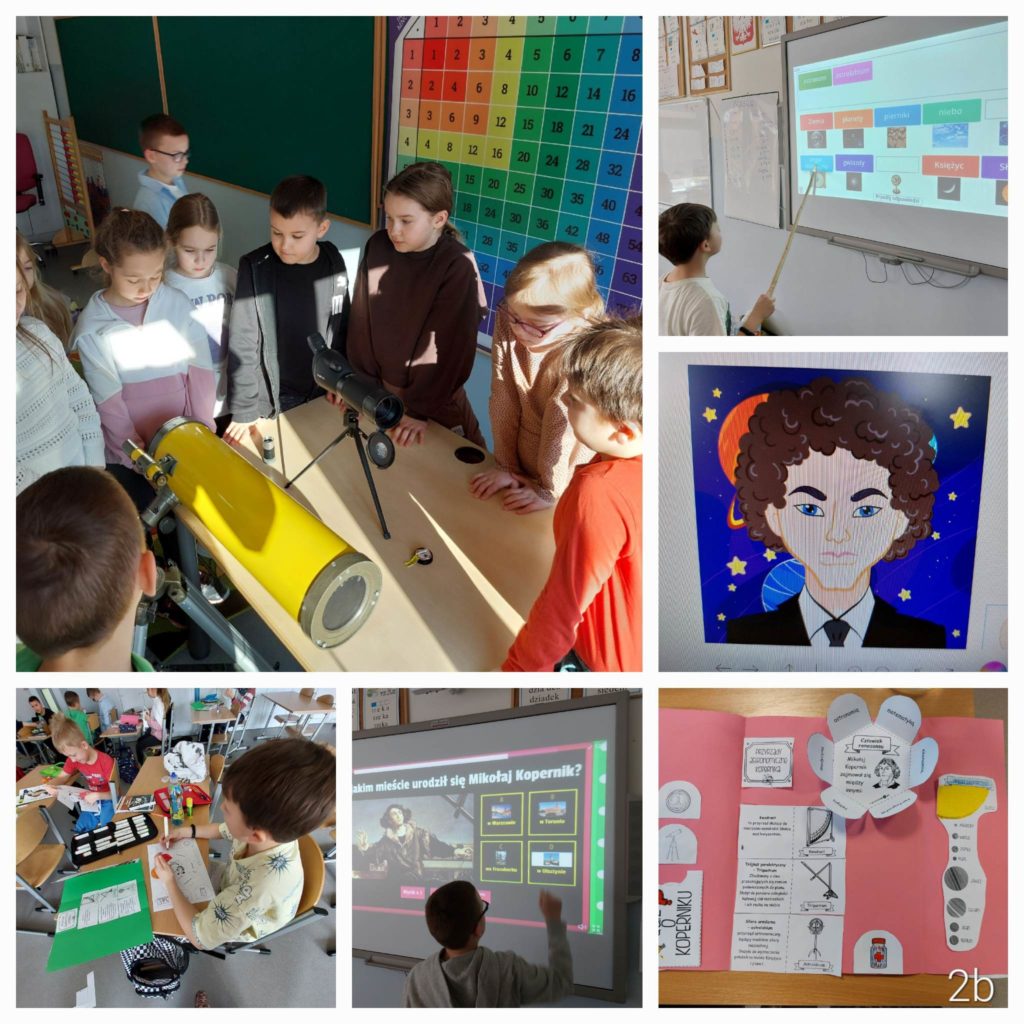 Ze względu na obchody 550 rocznicy urodzin Mikołaja Kopernika uczniowie klasy 2B zapoznali się z sylwetką tego astronoma. Obejrzeli film o Mikołaju, poznali jego najsłynniejszą teorię, oglądali prawdziwy teleskop i podziwiali przyrodę przez lunetę. Sprawdzali nabytą na zajęciach wiedzę przez rozwiązywanie quizów na tablicy multimedialnej. Później dzieci tworzyły wspaniałe lapbooki o Mikołaju Koperniku, avatary przedstawiające tego astronoma oraz Układy Słoneczne wykorzystując poznane programy komputerowe.