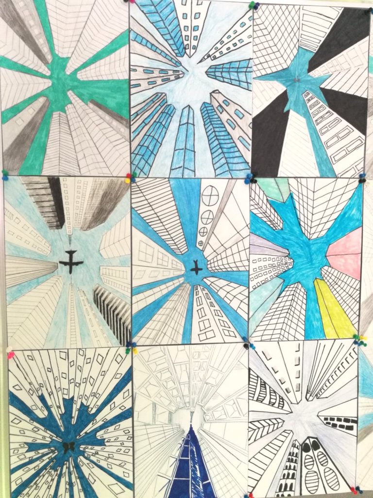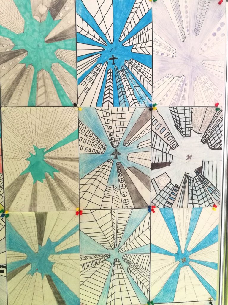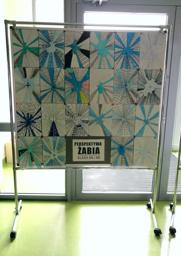Uczniowie klasy 6A i 6B na lekcjach plastyki wykonali prace przedstawiające miasto w perspektywie żabiej, która polega na postrzeganiu przedmiotów z dołu. Efekty można oglądać w holu na parterze.