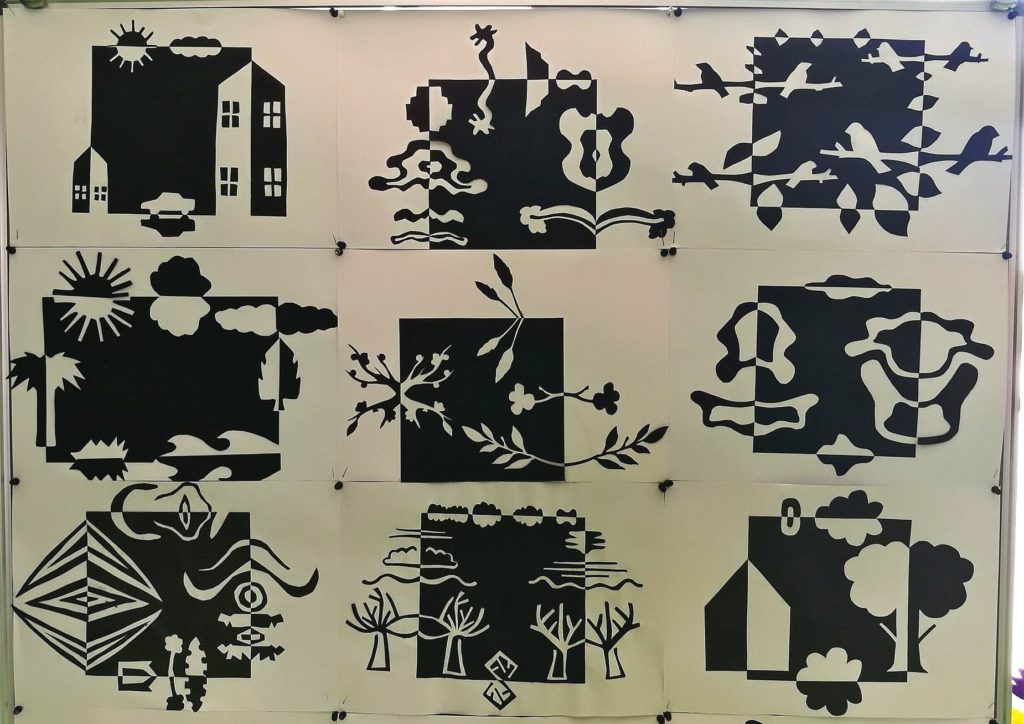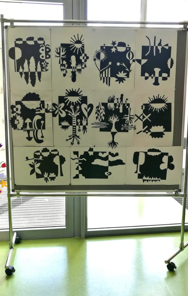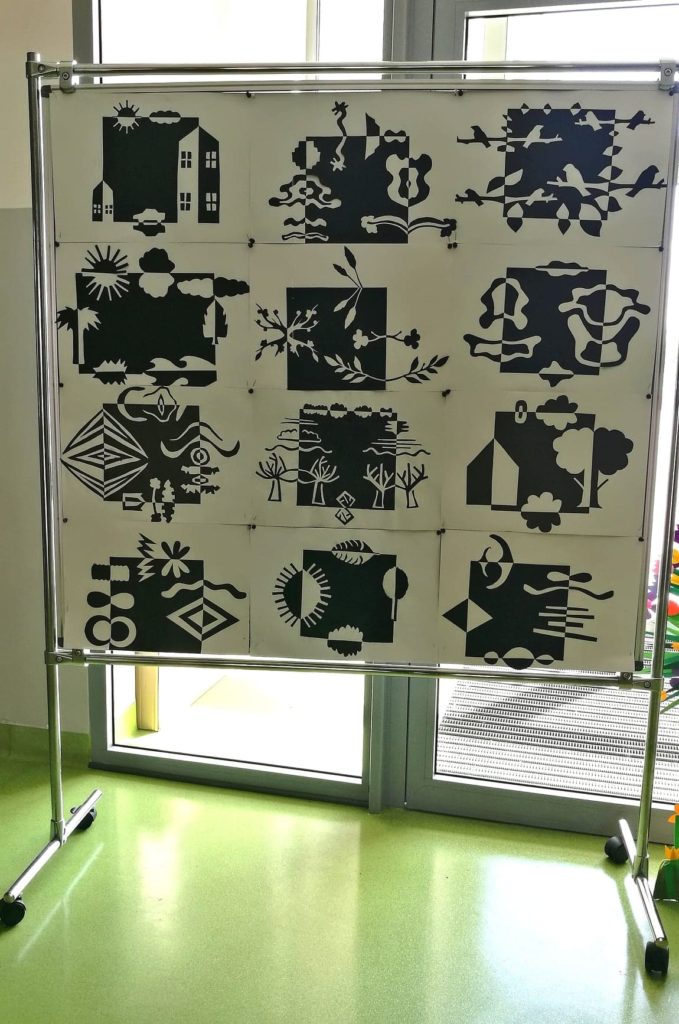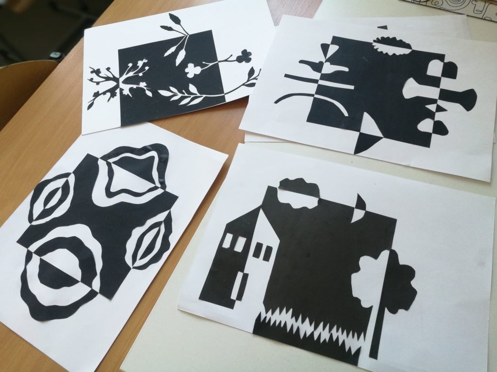 Uczniowie klasy 6A i 6B na lekcjach plastyki wykonali prace zgodne z podstawowymi zasadami japońskiej idei Nōtan. Kompozycja notan jest ograniczona do dwóch kolorów – najczęściej do czerni i bieli. Kształty mają mocno kontrastować ze sobą.