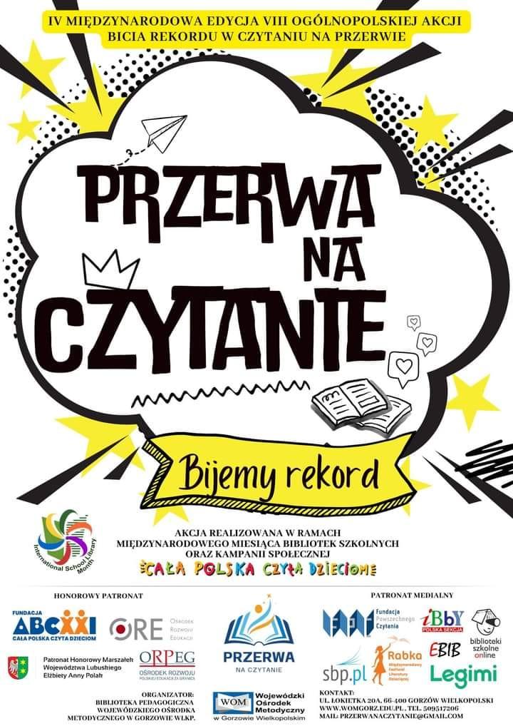 4 października br. (w środę) nasza szkoła kolejny raz weźmie udział w Międzynarodowej akcji „Przerwa na czytanie – bicie rekordu w czytaniu podczas przerw”. Przypominamy, aby tego dnia wziąć do szkoły ulubioną książkę. Szczegóły przebiegu akcji już wkrótce.