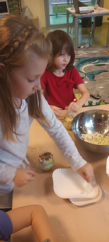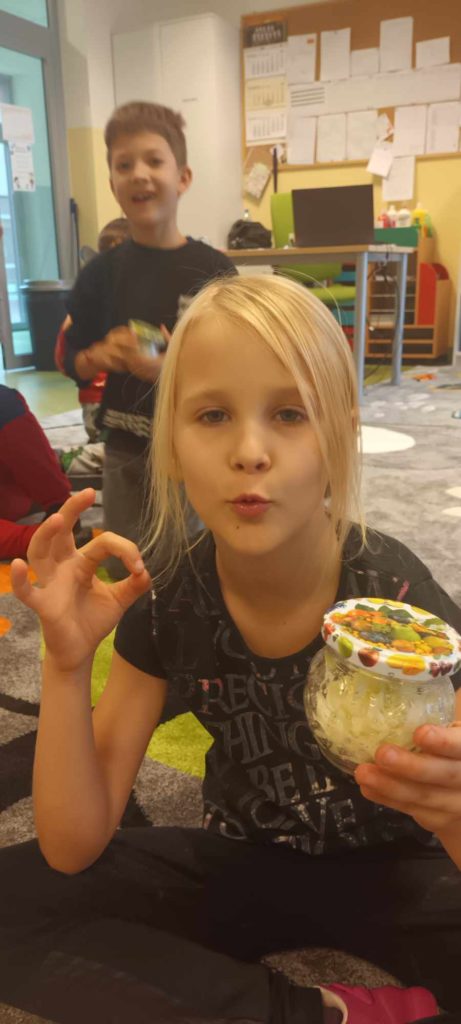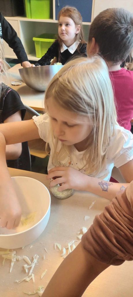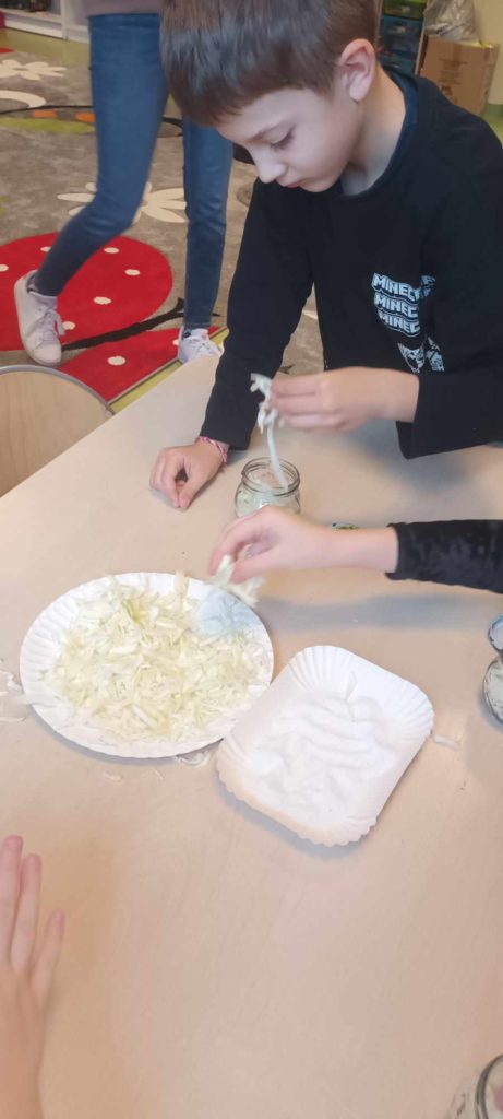 Jesień zachęca do robienia zapasów na zimę. Dzieci w trakcie pobytu w świetlicy zapoznały się ze sposobem kiszenia kapusty, który później zastosowały. Uczniowie dowiedzieli się, że kapusta jest bardzo zdrowa, posiada dużą ilość witamin i minerałów, które w okresie jesienno-zimowym są cennym składnikiem w naszej diecie.
