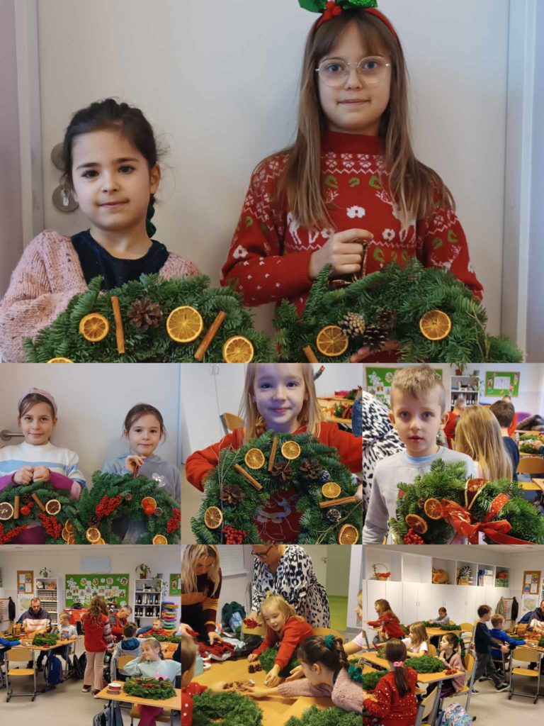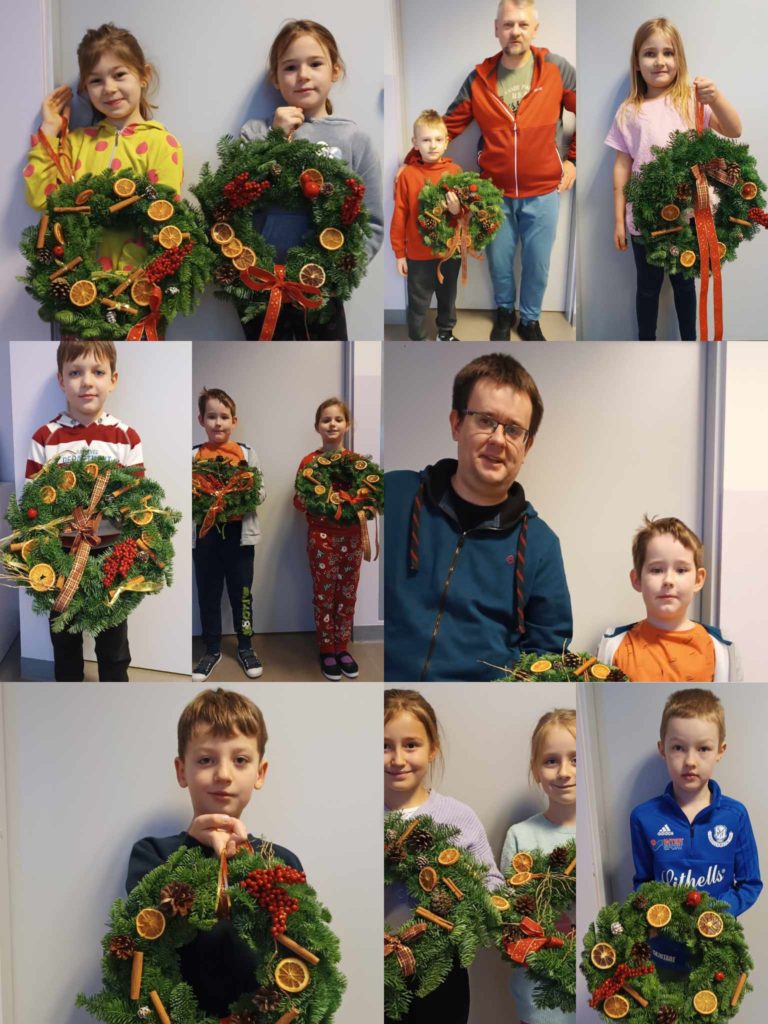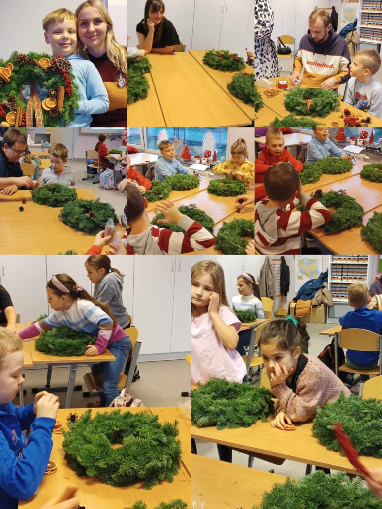 Uczniowie z klasy 1D wraz z rodzicami ozdabiali świąteczne wianki z prawdziwego igliwia. Do dekoracji używali suszonych pomarańczy, kory cynamonu, szyszek i świątecznych wstążek. Dzieci same projektowały swoje prace, ucząc się sztuki kompozycji. Zobaczyły też, jak przy użyciu naturalnych materiałów można uzyskać bardzo ładne dekoracje, które będą ozdabiały ich domy w tym wyjątkowym czasie.
