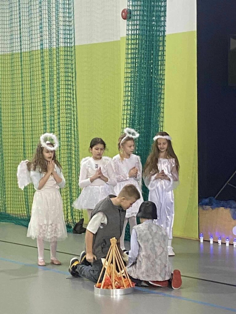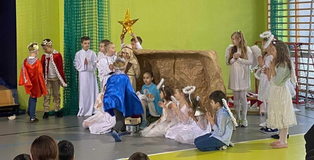 11 stycznia br. na naszej szkolnej scenie zostały wystawione coroczne jasełka. Przedstawienie przygotowali uczniowie klasy 2A. W pięknie udekorowanej sali zebrali się goście: dzieci z Przedszkola Miejskiego nr 1 w Pruszkowie oraz uczniowie oddziału przedszkolnego naszej szkoły. Po przywitaniu zgromadzonej publiczności przez Panią Dyrektor Aleksandrę Kurtz, wszyscy obecni mogli przenieść się na niebiańską polanę i podziwiać wspaniały występ, któremu towarzyszyły oprawy – muzyczna i taneczna. Duże zaangażowanie młodych aktorów wywarło ogromne wrażenie na publiczności. Bardzo dziękujemy Panu Jakubowi Małeckiemu za techniczne wsparcie podczas wydarzenia.