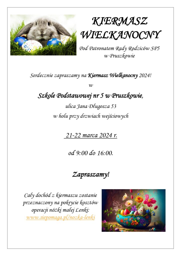 W imieniu Pani Dyrektor i Rady Rodziców serdecznie zapraszamy na Kiermasz Wielkanocny, którego dochód zostanie przekazany dla Lenki Woźniak.
