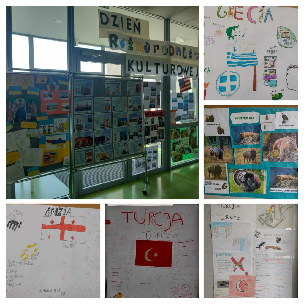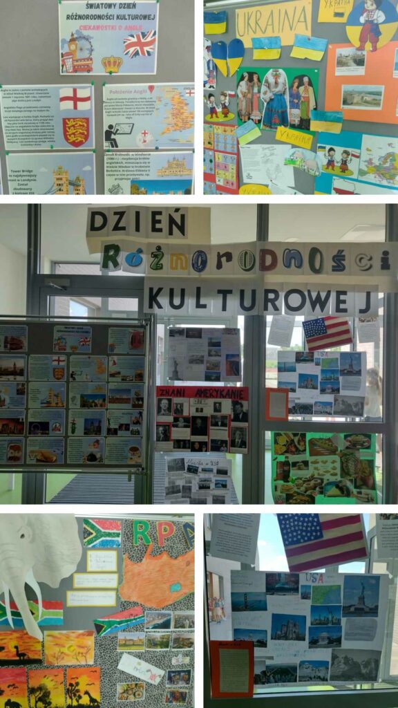 Światowy Dzień Różnorodności Kulturowej dla Dialogu i Rozwoju jest obchodzony na świecie 21 maja. Z tej okazji uczniowie klas 0-3 przygotowali gazetki tematyczne, które dotyczyły: Bułgarii, Gruzji, Ukrainy, RPA, USA, Wielkiej Brytanii, Turcji oraz Białorusi. Uczniowie wzięli również udział w quizie nt. znajomości tych krajów. W ten sposób poznaliśmy kulturę krajów uczniów naszej szkoły oraz ich zróżnicowanie kulturowe i językowe. Przypomnieliśmy sobie jak ważna jest tolerancja i poszanowanie oraz świadomość tego, jak pięknie potrafimy się różnić. Nasi uczniowie z chęcią zaangażowali się w to wydarzenie. Wykonane prace można podziwiać na szkolnych korytarzach.