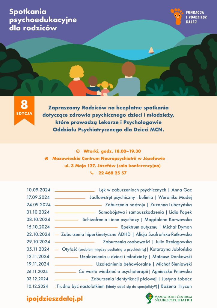 Zachęcamy Państwa do udziału w spotkaniach psychoedukacyjnych dla rodziców. Spotkania będą się odbywały we wtorki od 18:00 do 19:00 w Mazowieckim Centrum Neuropsychiatrii w Józefowie. Poniżej terminarz i tematyka spotkań.