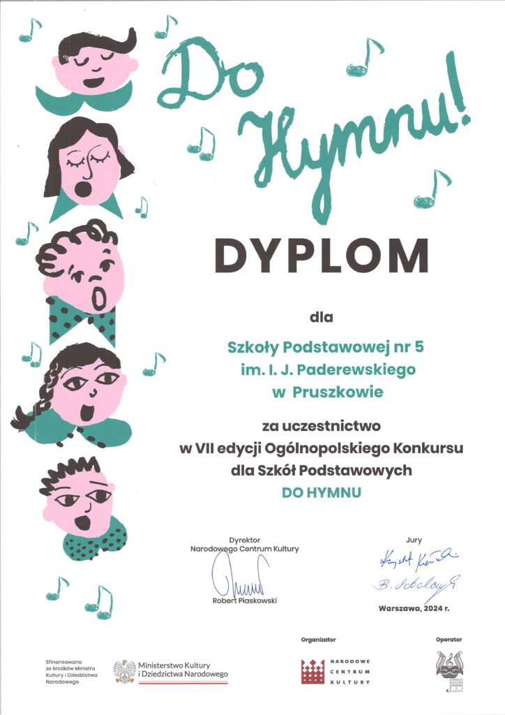 Z dumą informujemy, że Szkoła Podstawowa nr 5 im. I. J. Paderewskiego w Pruszkowie wzięła udział w VII edycji konkursu #DoHymnu! W odśpiewaniu Hymnu, Roty i Pieśni powstańców 1863 r. udział wzięło ponad 530 uczniów. Występ odbył się w obecności jury konkursu. Jesteśmy dumni, że mogliśmy uczestniczyć w tak podniosłym wydarzeniu, które promuje patriotyzm. Dziękujemy wszystkim uczniom i nauczycielom za zaangażowanie i udział w konkursie.