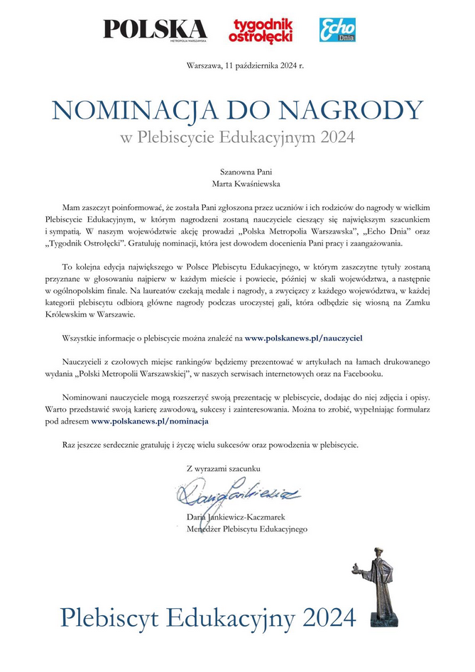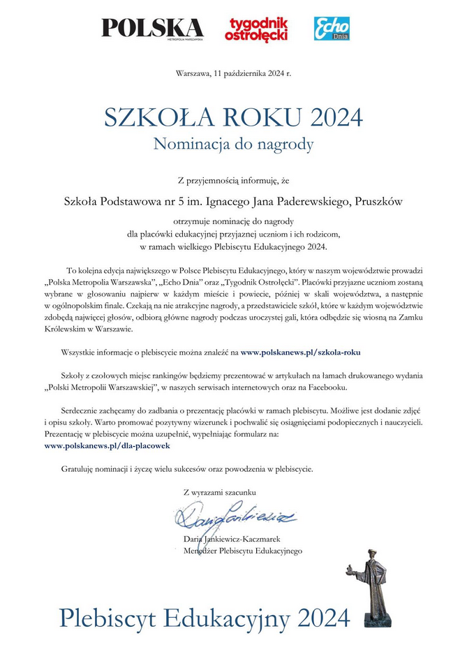 w wielkim Plebiscycie Edukacyjnym, który w województwie mazowieckim jest prowadzony przez Polska Times, Echo Dnia oraz Tygodnik Ostrołęcki.