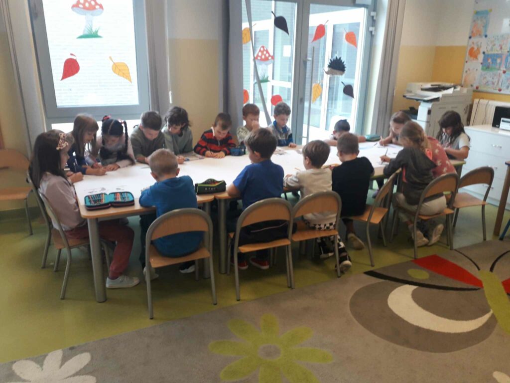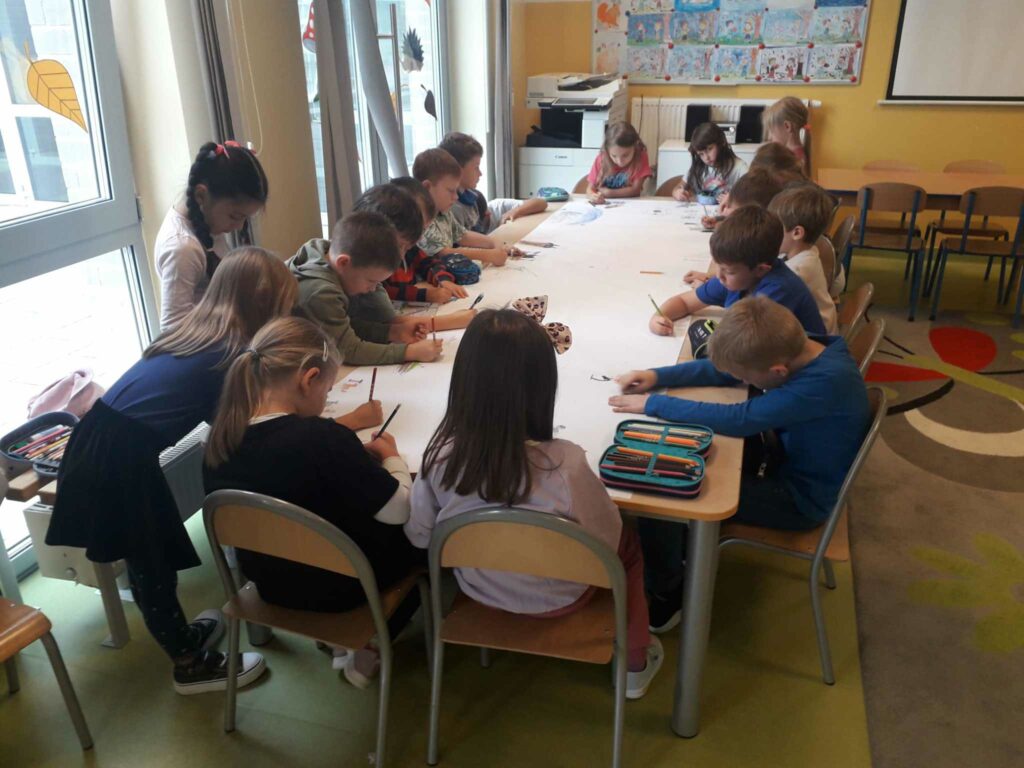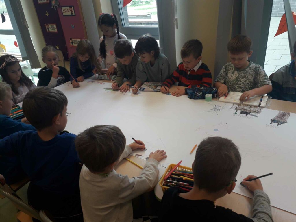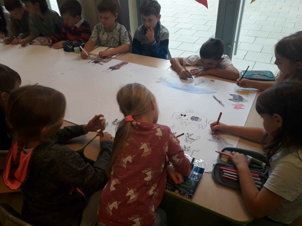 Z okazji Światowego Dnia Zwierząt dzieci w świetlicy opowiadały o sposobach opieki nad swoim zwierzakiem. Następnie wspólnie rysowały ulubione lub wymarzone zwierzątko na dużym formacie papieru.