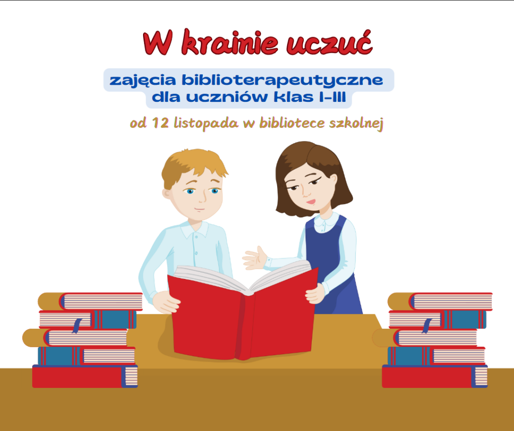 12 listopada br. rozpoczęły się w bibliotece szkolnej cykliczne zajęcia biblioterapeutyczne: „W krainie uczuć”. Uczniowie z klas 1-3 w małych grupach będą na nie zapraszani przez nauczyciela – bibliotekarza, w czasie ich pobytu w świetlicy szkolnej.