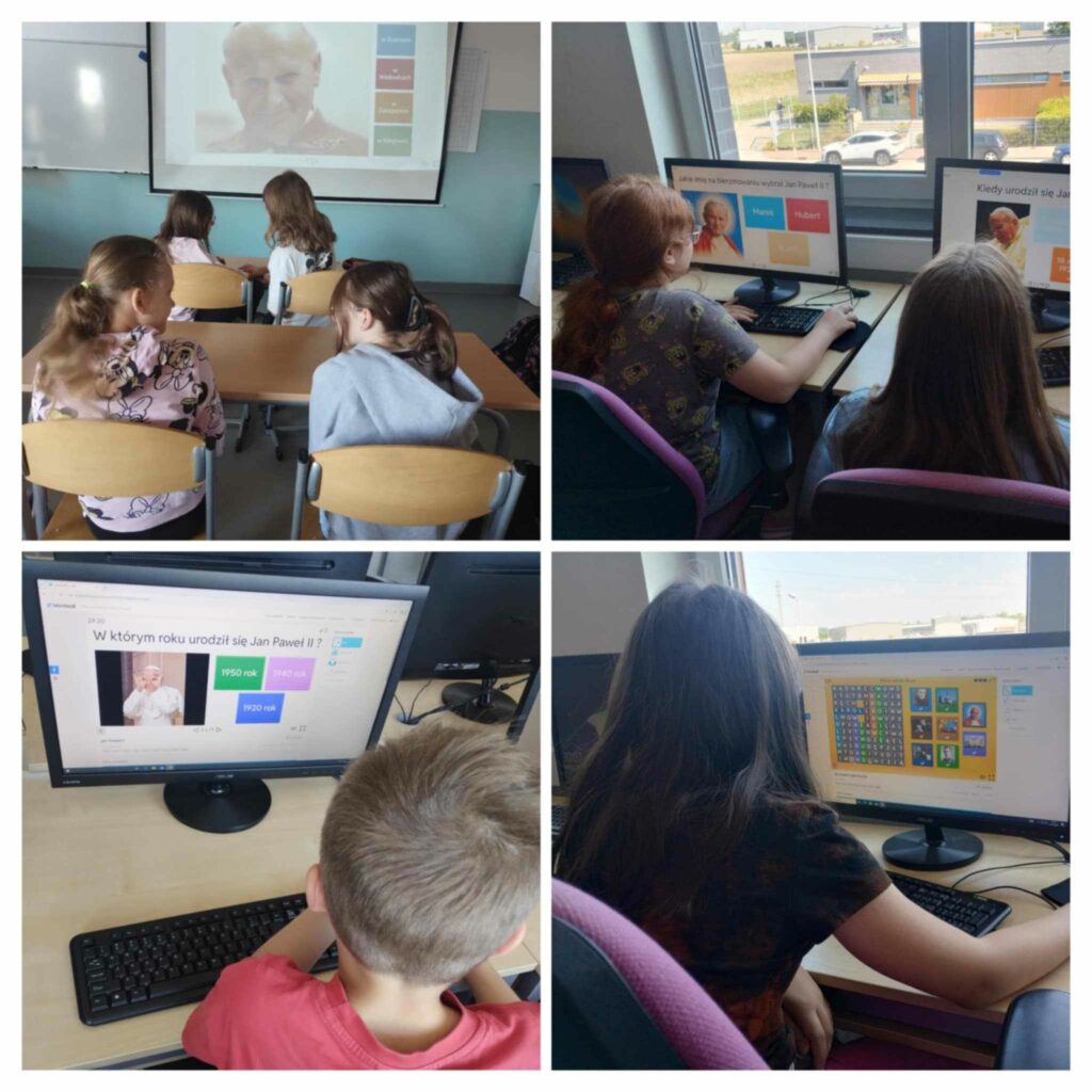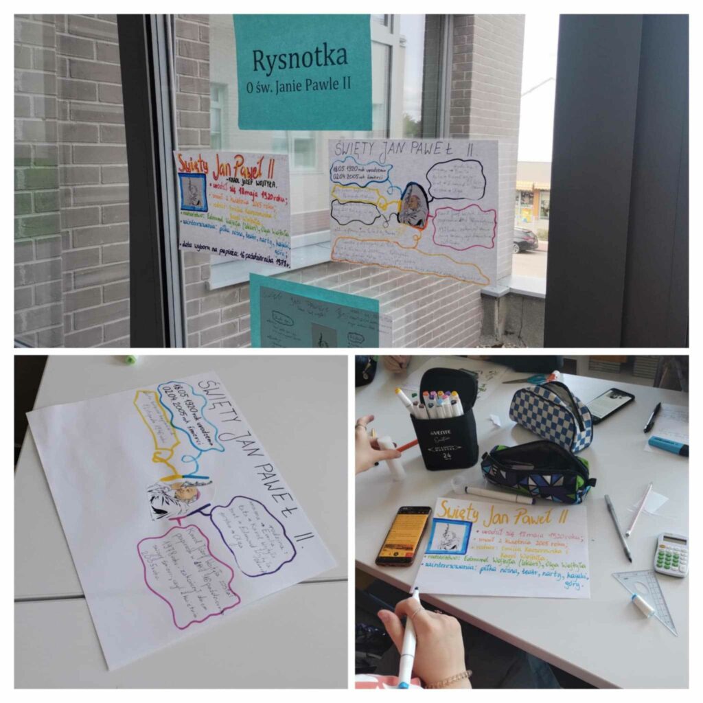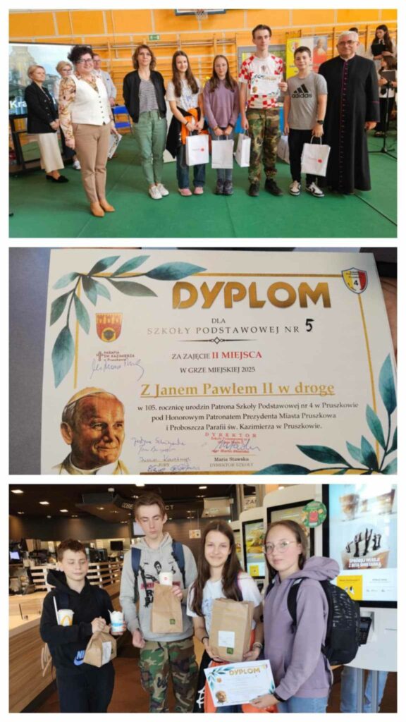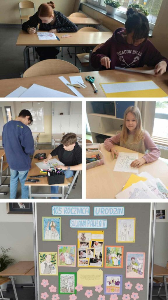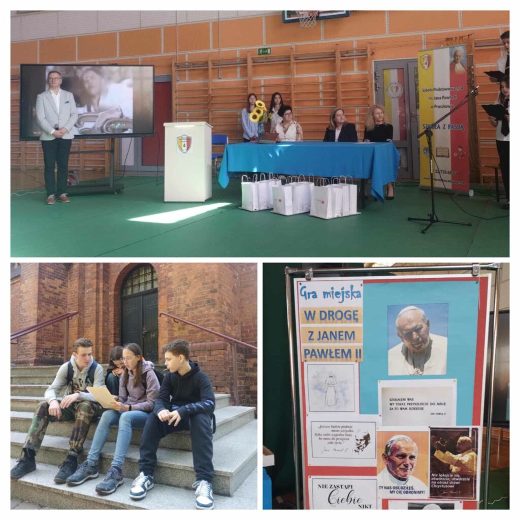 18 maja br. nasza szkoła uczciła 105. rocznicę urodzin św. Jana Pawła II – Wielkiego Polaka, który na zawsze zapisał się w historii naszego narodu i Kościoła. Z tej okazji uczniowie wzięli udział w różnorodnych aktywnościach upamiętniających postać Papieża Polaka. W ramach działań: – przygotowali gazetkę ścienną metodą „sztafety”, – tworzyli rysnotki poświęcone życiu Jana Pawła II, – rozwiązywali quizy sprawdzające wiedzę o jego biografii, – podjęli próbę wspólnego wykonania pieśni oazowej „Barka”. Zwieńczeniem obchodów było uczestnictwo przedstawicieli klas IV–VIII w Grze Miejskiej „Z Janem Pawłem II w drogę”, zorganizowanej przez Szkołę Podstawową nr 4 w Pruszkowie. Z dumą informujemy, że nasza drużyna zdobyła II miejsce. Wierzymy, że dzięki tym wydarzeniom pamięć o św. Janie Pawle II pozostanie żywa w sercach i umysłach naszych uczniów.