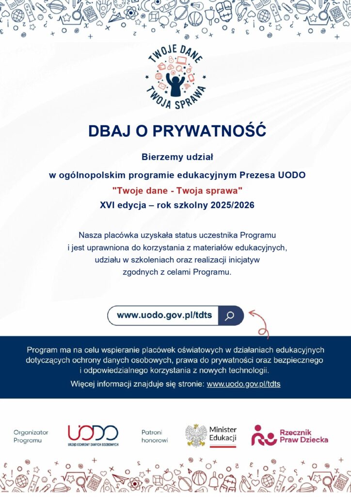 Celem programu „Twoje dane – Twoja sprawa”, realizowanego od 2009 roku z inicjatywy Urzędu Ochrony Danych Osobowych, jest systematyczne podnoszenie świadomości w zakresie ochrony danych osobowych i prawa do prywatności. Program uczy, jak bezpiecznie funkcjonować w świecie nowych technologii, wspiera rozwój kompetencji cyfrowych oraz kształtuje postawy odpowiedzialnego korzystania z internetu i urządzeń cyfrowych.