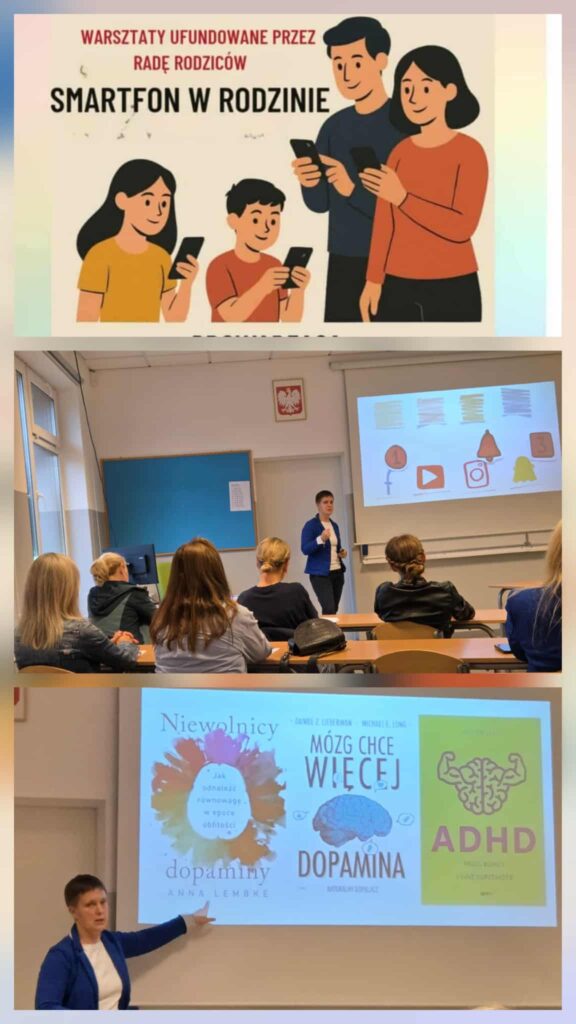 Dziękujemy wszystkim rodzicom za obecność, panu Andrzejowi Żygadło za pomoc w organizacji wydarzenia oraz Radzie Rodziców za jego sfinansowanie. Wierzymy, że zdobyta wiedza i refleksje będą inspiracją do dobrych zmian – zarówno w korzystaniu z nowych technologii, jak i w budowaniu mocnych, wartościowych relacji w rodzinie.