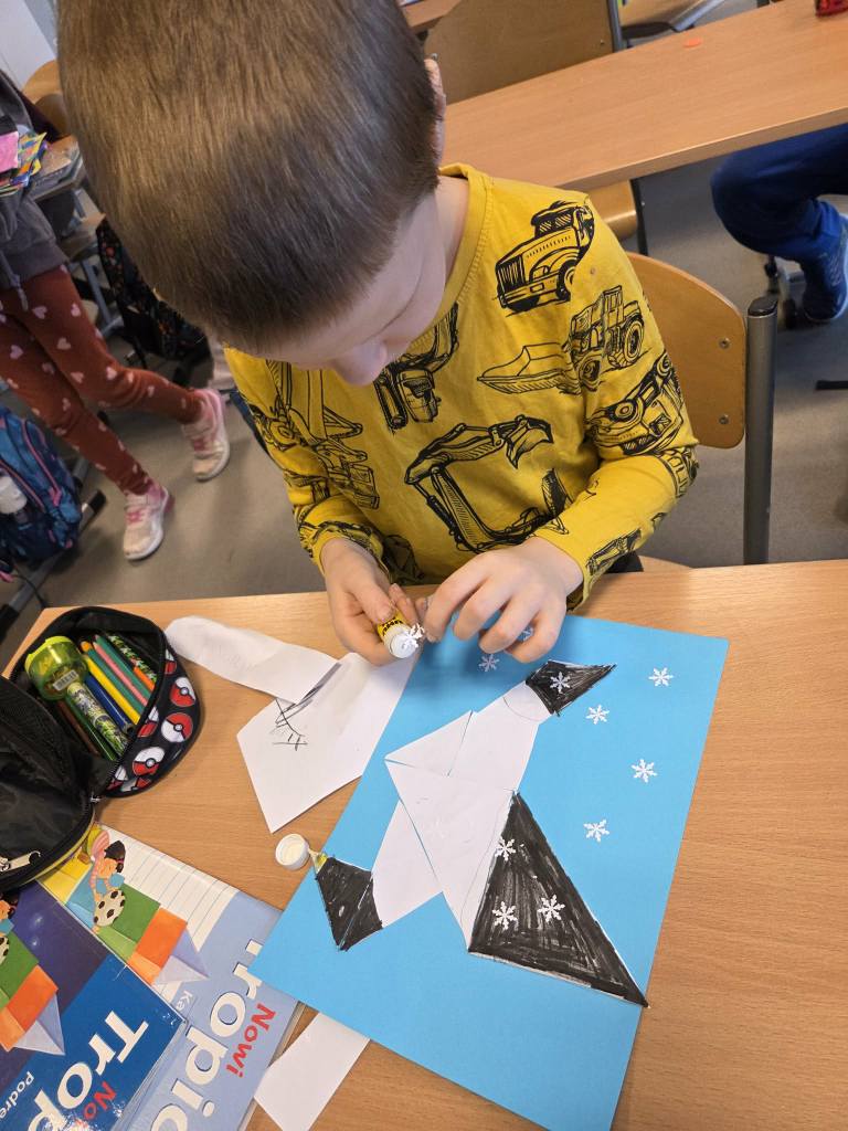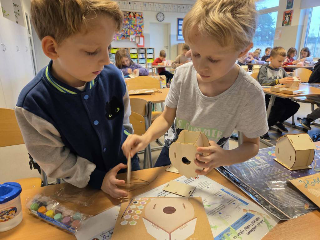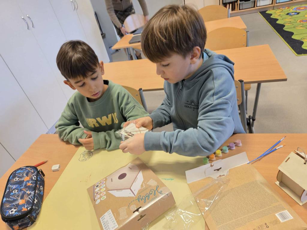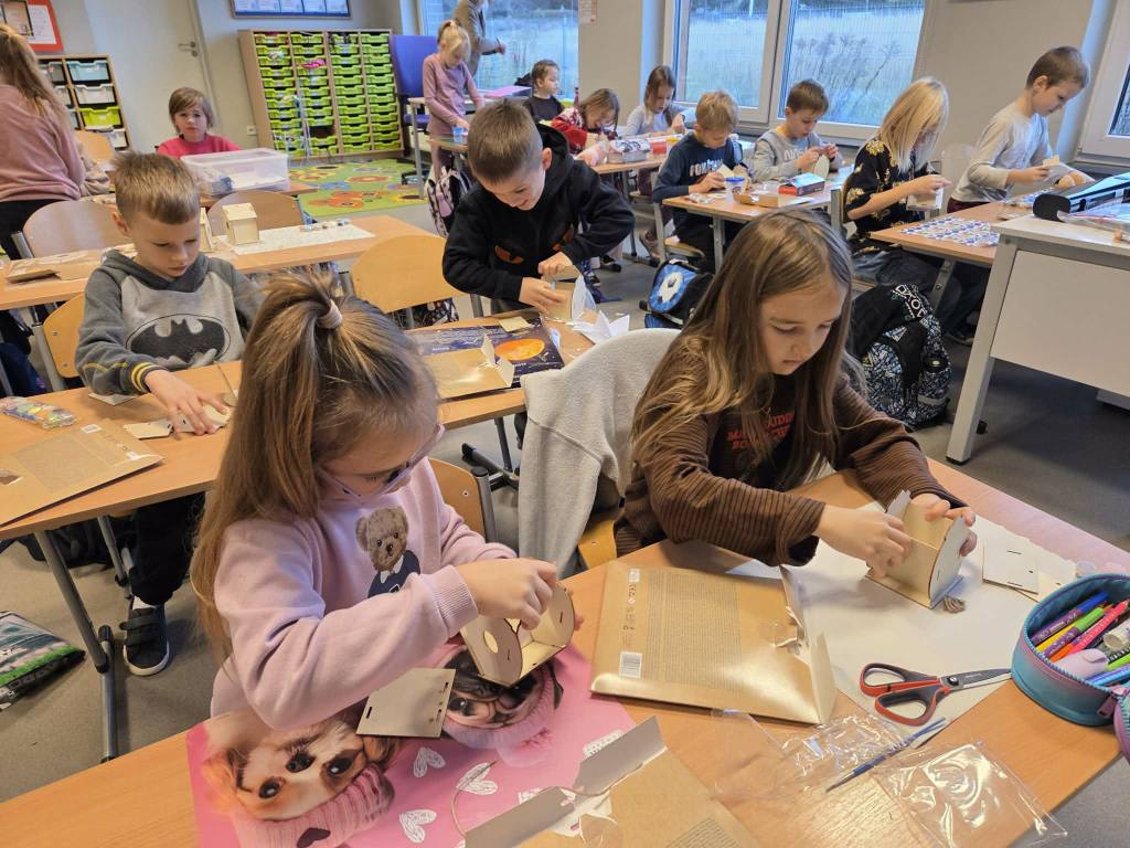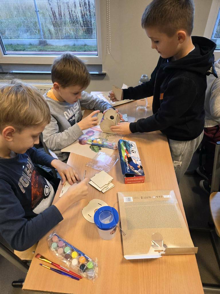 Powstały świetne prace, a uczniowie z zaangażowaniem odkrywali, jak różne przedmioty mogą łączyć się w jeden temat. Serdeczne podziękowania dla p. Eli Antczak – mamy Elizy – za pomoc w przygotowaniu materiałów do budowy karmników.